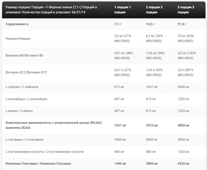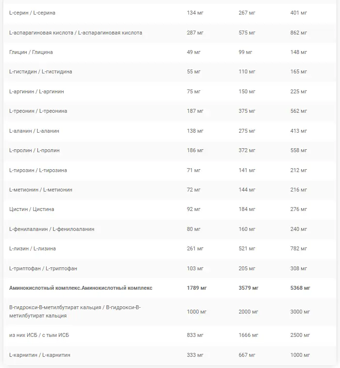 Ингредиенты: Смесь аминокислот (L-аспарагиновая кислота, L-лизин, L-треонин, L-пролин, L-аланин, L-серин, L-триптофан, L-цистеин, L-фенилаланин, L-аргинин, L-тирозин, L-метионин, L-гистидин, глицин), комплекс BCAA 2:1:1 (L-лейцин, L-изолейцин, L-валин), глютаминовый комплекс (L-глутамин, L-глутаминовая кислота), β-гидрокси β- метилбутират кальция, L-карнитин, ароматизатор, ароматизаторы7, витаминный премикс [ниацин (никотинамид), витамин B6 (пиридоксина гидрохлорид), витамин B12 (цианокобаламин)], регулятор кислотности (лимонная кислота), антислеживатель (диоксид кремния), подсластители (сукралоза, ацесульфам К), краситель (Е160а1.4.7, Е163), концентрат сока красной свеклы.
