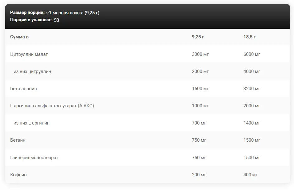 Пищевая добавка. С подсластителями. Содержит кофеин (200 мг/порция 9,25 г; 400 мг/дневная порция 18,5 г). Не рекомендуется детям и беременным женщинам. Предтренировочная формула, содержащая цитруллин малат, бета-аланин и бетаин, предназначена для физически активных взрослых.