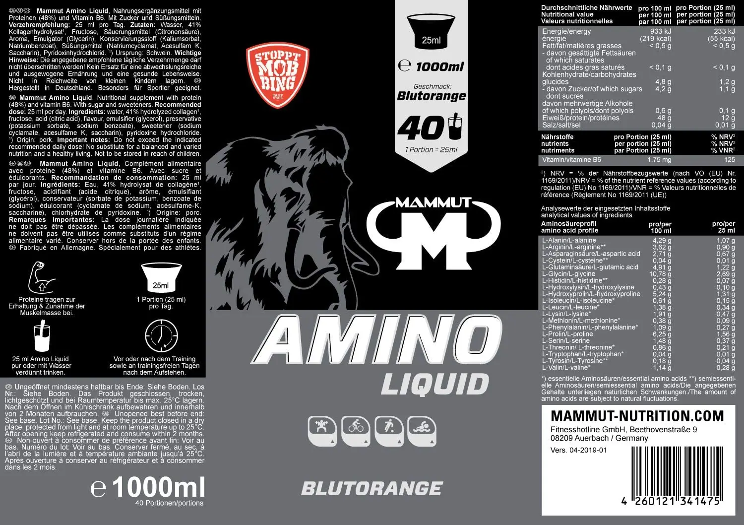 Mammut рекомендует 25 мл чистой аминожидкости или разбавленной водой. Подходящее время - до или после тренировки. В дни, свободные от поездов, Маммут рекомендует съедать порцию сразу после пробуждения.