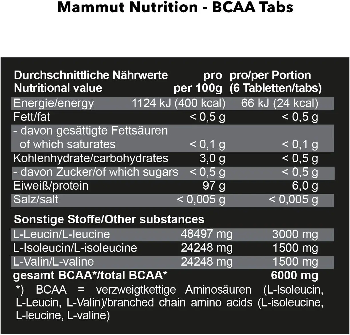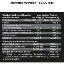 Таблетки BCAA от Mammut содержат очень большую порцию 3 незаменимых аминокислот L-изолейцина, L-лейцина и L-валина в одной таблетке. Первоклассный продукт, специально разработанный для спортсменов, ориентированных на силу и выносливость. Благодаря специальной формуле достигается непревзойденное содержание 6000 мг BCAA в одной порции. BCAA - это английское название аминокислот с разветвленной цепью (аминокислоты с разветвленной цепью). Они включают L-изолейцин, L-лейцин и L-валин. Эти аминокислоты незаменимы, что означает, что они должны поступать в организм с пищей. Аминокислоты сами по себе являются основными строительными блоками белков. В дополнение к положительному эффекту увеличения и поддержания мышц, белки также способствуют поддержанию нормальных костей. В отличие от многих капсул, BCAA tabs от Mammut не содержат желатина, поэтому они хороши для всех, кто хочет обойтись без ингредиентов животного происхождения. Кроме того, Mammut не использует в таблетках красители, подсластители и консерванты. Кроме того, полностью был исключен коллагеновый белок, а также источники белка из пшеницы, гороха и белка люпина. Mammut рекомендует принимать 6 таблеток BCAA ежедневно. Оптимальное время приема - непосредственно перед тренировкой, потому что силовые тренировки стимулируют синтез белка в мышечных клетках, что, в свою очередь, оказывает положительное влияние на рост клеток. Целенаправленное поступление белка приводит к положительному балансу белка в мышцах. Таким образом, оптимально используются положительные свойства белка для наращивания и поддержания мышечной массы. В дни, свободные от тренировок, рекомендуется принимать непосредственно после пробуждения. Таблетки BCAA от Mammut удобны в дозировании.