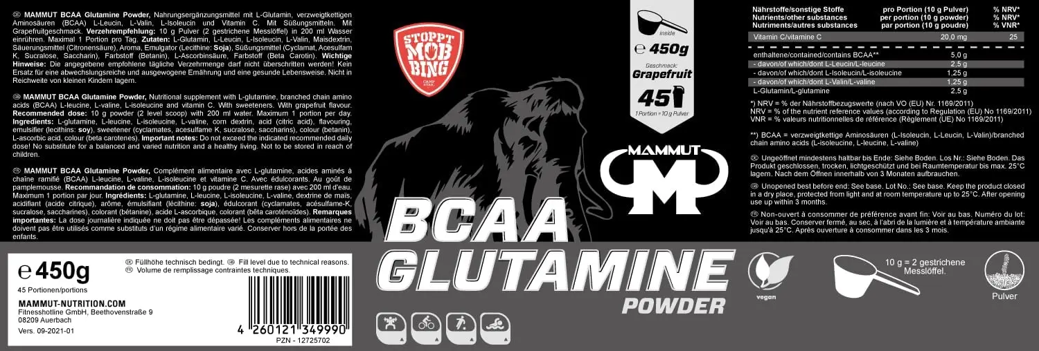 Mammut BCAA glutamine powder - это высококачественный порошок без консервантов. Готовый напиток с освежающим вкусом грейпфрута идеально подходит для приготовления до и во время тренировки. Каждая порция содержит 5 г BCAA и 2,5 г L-глютамина. BCAA расшифровывается как "аминокислоты с разветвленной цепью". Это аминокислоты с разветвленной цепью, которые включают L-лейцин, L-изолейцин и L-валин. В глютаминовом порошке Mammut BCAA BCAA присутствуют в соотношении 2: 1: 1 (L-лейцин: L-изолейцин: L-валин). BCAA - это три из 8 незаменимых аминокислот, которые должны поступать в наш организм с пищей, поскольку он не способен их образовывать. Наш организм нуждается в белке и, следовательно, в аминокислотах для наращивания и поддержания мышц. Преимущество BCAA по сравнению с другими аминокислотами заключается в том, что они являются свободными аминокислотами и поэтому немедленно доступны организму. L-глютамин является незаменимой аминокислотой и играет важную роль в транспортировке азота в организме. Для спортсменов, которые занимаются силовыми тренировками или тренировками на выносливость, в идеале рекомендуется принимать добавки с L-глютамином. Кроме того, глютаминовый порошок BCAA обогащен витамином С. Витамины являются важными питательными веществами. Организм не может вырабатывать их сам, они должны поступать к нему с пищей или добавками. Содержащийся в нем витамин С способствует снижению утомляемости и утомляемости, нормальному функционированию иммунной системы, нормальному энергетическому обмену и защите клеток от окислительного стресса. Mammut рекомендует 10 г в день (= 2 мерные ложки по 8 мл) порошка глютамина BCAA с 200 мл воды (комнатной температуры) до и / или во время тренировки. В дни, свободные от тренировок, рекомендуется принимать после пробуждения. Глютаминовый порошок Mammut BCAA с глутамином выпускается в жестяной банке по 450 г.