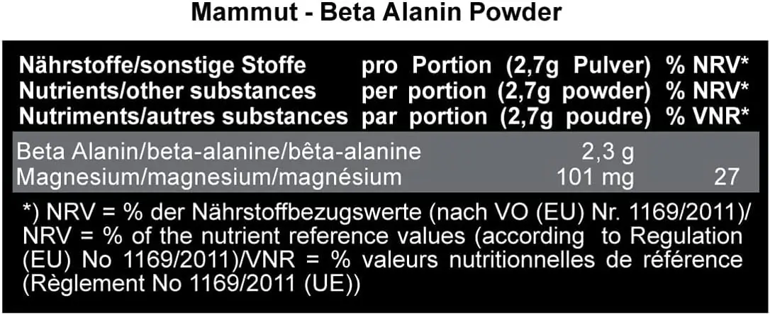 Мамонт рекомендует принимать 2,7 г порошка бета-аланина в день (= одна ложка с покрытием) с водой или другими напитками перед тренировкой. В дни, свободные от тренировок, Маммут рекомендует запивать большим количеством воды сразу после того, как вы встанете с постели. В одной банке содержится 300 г.