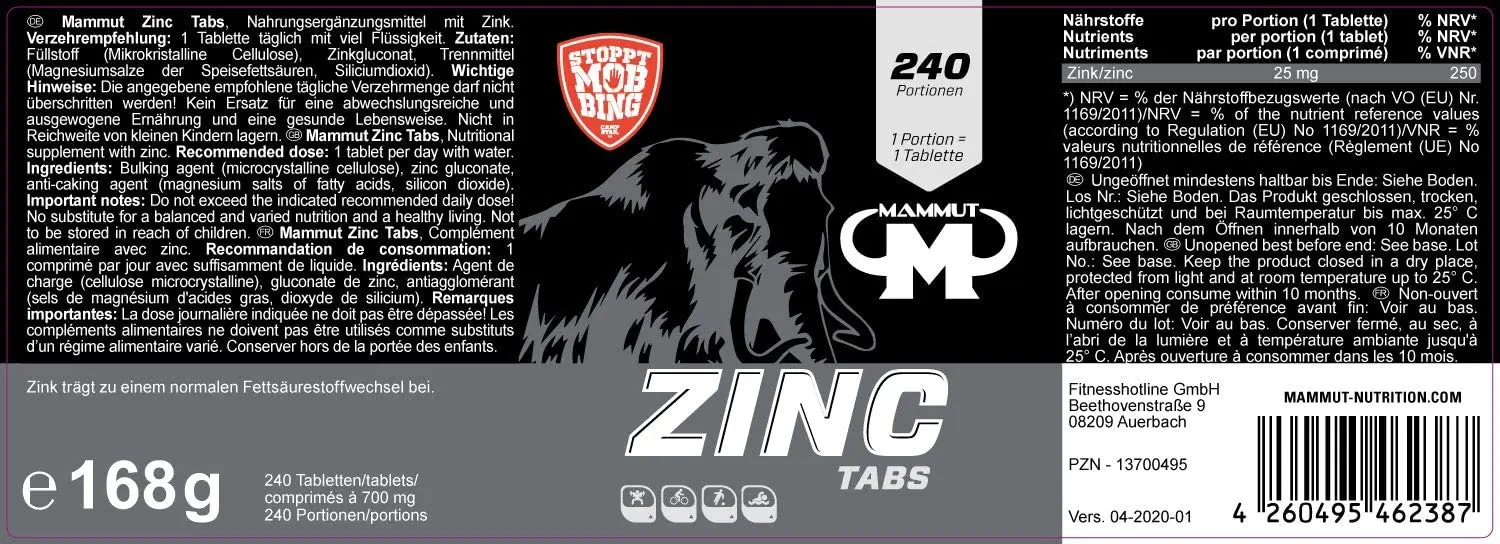 Таблетки Mammut Zinc содержат 25 мг цинка на таблетку. Глюконат цинка используется в качестве соединения цинка. Глюконат цинка - это органическое соединение цинка. Цинк сам по себе является одним из важнейших минералов. Это жизненно важные питательные вещества для организма, которые необходимо получать с пищей, поскольку он не может вырабатывать их сам. Цинк выполняет различные функции в нашем организме. Способствует поддержанию нормальной кожи, волос, ногтей и костей. Цинк способствует нормальному метаболизму жирных кислот и нормальному синтезу белка. Кроме того, цинк способствует нормальному функционированию иммунной системы. В дополнение ко многим положительным эффектам, занятия фитнесом и спортом на выносливость также приводят к повышенному образованию свободных радикалов, которые могут вызвать повреждение клеток. Минеральный цинк способствует защите клеточных компонентов от окислительного стресса и поэтому должен поступать в достаточном количестве. Окислительный стресс также связан со старением клеток. Антиоксиданты, такие как цинк, уменьшают последствия окислительного стресса. Mammut рекомендует принимать по 1 таблетке цинка в день во время любого основного приема пищи. В одной банке содержится 240 таблеток.