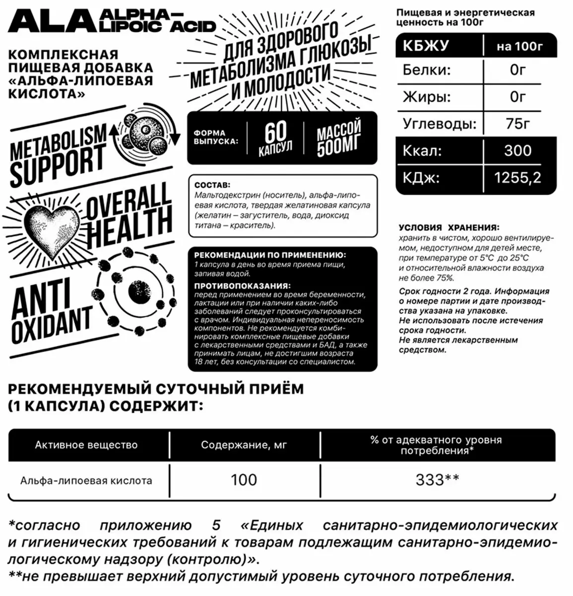 Альфа-липоевая кислота участвует в метаболизме, ускоряя обмен веществ и способствуя похудению. Притупляет голод, повышает выработку энергии, улучшает усвоение глюкозы и усиливает восприимчисвость тканей к инсулину. Альфа-липоевая кислота также обладает антиоксидантным свойсвтом, защищая организм от свободных радикалов.