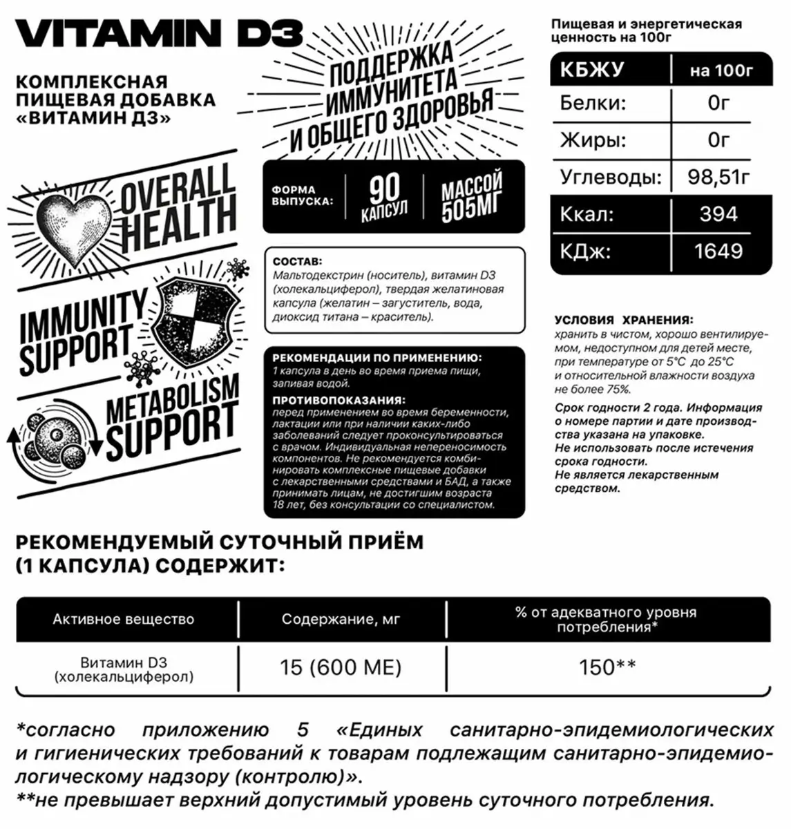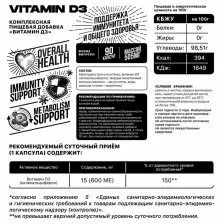 Состав: Мальтодекстрин (носитель), витамин D3 (холекальциферол), твердая желатиновая капсула (желатин - загуститель, вода, диоксид титана - краситель).