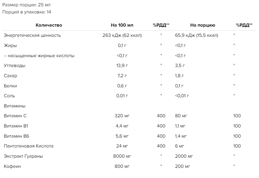 Одна порция Energy Storm Guarana 2000 составляет 25мл (1 ампула). Для повышения эффективности тренировки рекомендуется принимать 1 ампулу за 10–15 минут до тренировки. Предостережение: Принимать по потребности, но не более 2 порций в день. Не смешивать с алкоголем. Не рекомендуется детям, больным диабетом, лицам с индивидуальной непереносимостью кофеина, при высоком давлении и сердечно-сосудистых заболеваниях.