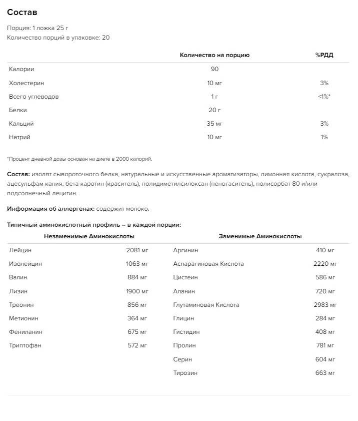- Высокое содержание белка: 20 г сывороточного изолята в каждой порции для поддержки мышечной массы и ускорения восстановления.