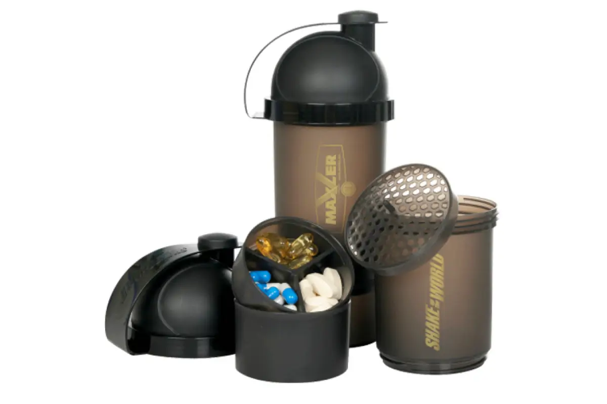 Кроме того, в комплектацию шейкера Maxler SMART 3-in-1 входят два дополнительных контейнера и таб-бокса, которые позволяют всегда иметь под рукой дополнительные порции концентрата, а также хранить другие витаминные комплексы.