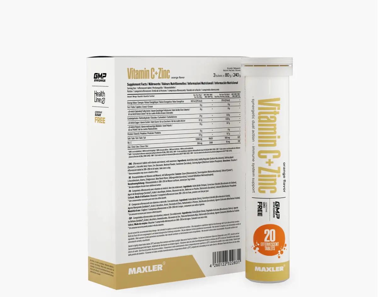 Maxler Vitamin C + Zinc — шипучие таблетки с витамином C (500 мг) и цинком (10 мг) в каждой порции. Комплекс разработан для мощной поддержки иммунной системы, ускоренного восстановления и укрепления здоровья, особенно в сезон простуд.