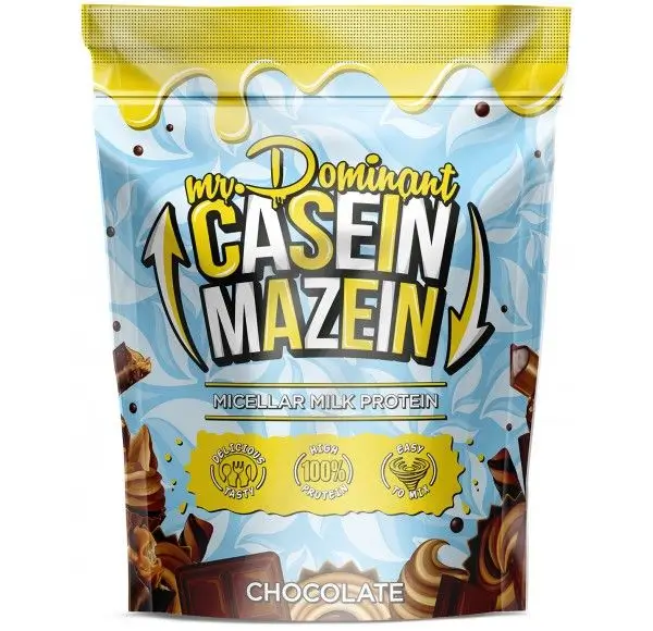 Casein Mazein сразу же привлекает внимание своей яркой упаковкой и шутливым названием. Casein Mazein, разработанный российским брендом спортпита Mr.Dominant, обладает высоким качеством. К важным плюсам протеина можно отнести, то что он не содержит сои, красителей и глютена.