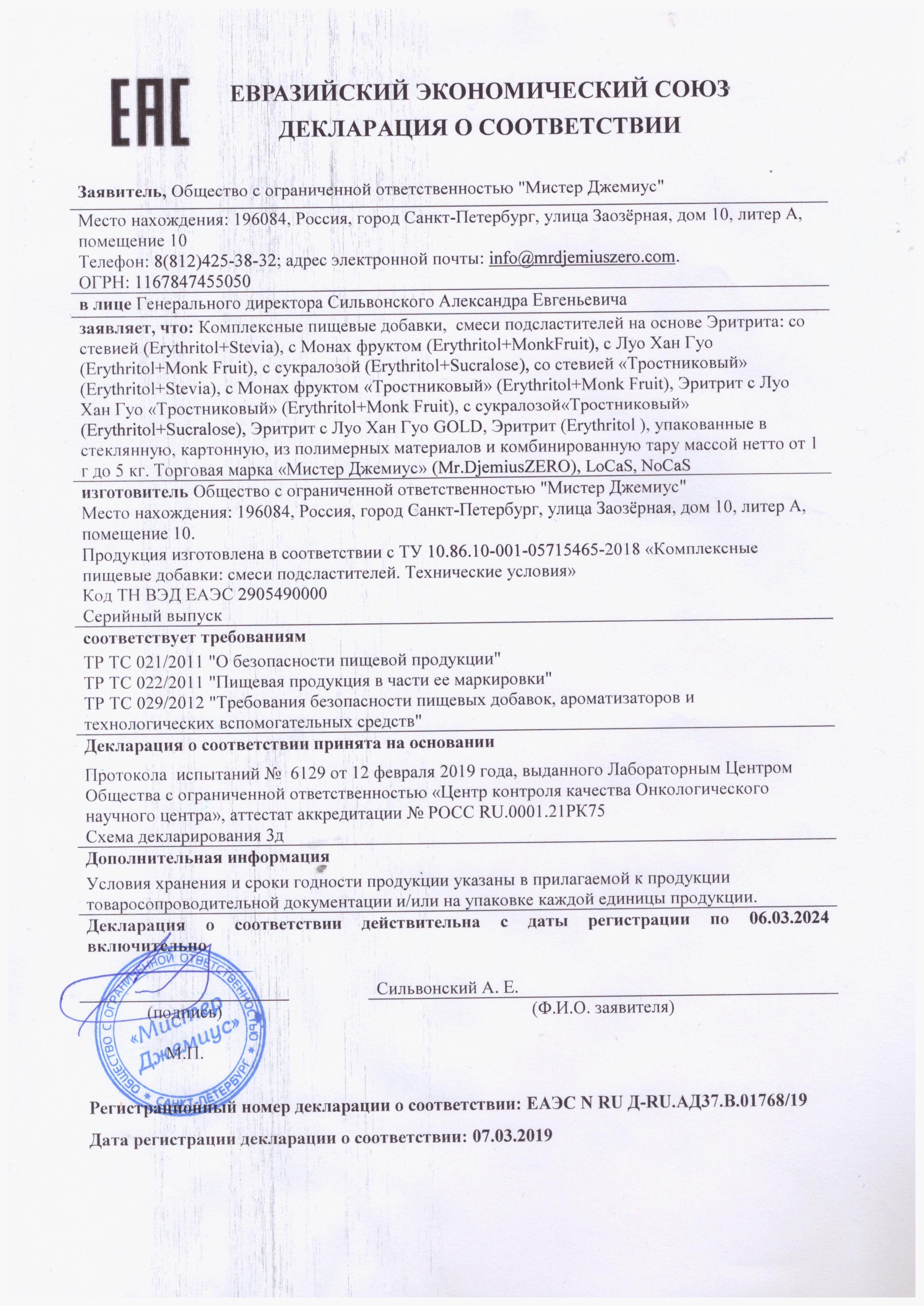 Mr.Djemius Сахарозаменитель Nocas (Эритритол+МонкФрут тростниковый) 300г