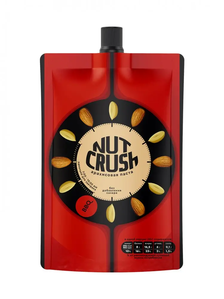 Арахис жареный, миндаль жареный, масло соевое, концентрат молочного белка, мед, томатный порошок, паприка копченая, эмульгатор соевый лецитин, соль, лук сухой, имбирь сухой, ароматизатор хикори, чеснок сухой, смесь специй. На предприятии используется арахис, горчица, сельдерей, кунжут, соя, злаки, орехи, молоко, яйца, рыба и продукты их переработки. Противопоказания: индивидуальная непереносимость ингредиентов продукта.