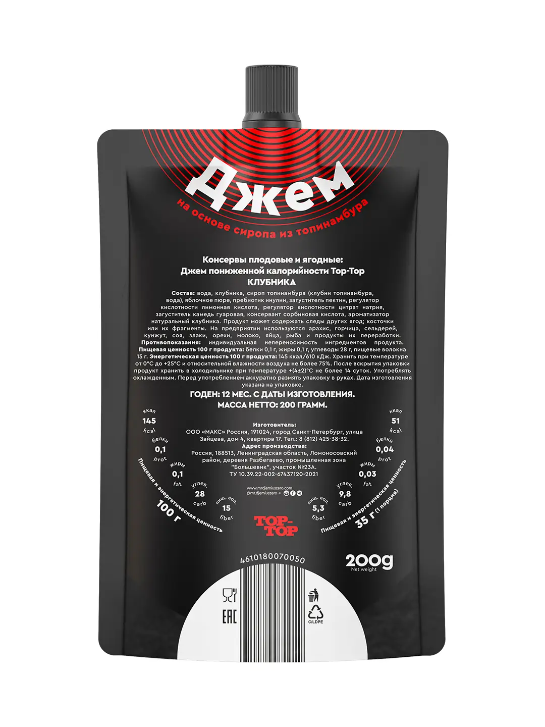 Клубничный джем без сахара Тор-Тор — это натуральный состав и отсутствие сахара: он сделан из спелой клубники и сиропа топинамбура. Содержание фруктовой части — 60%. Благодаря замене традиционного сахара на полисахариды — инулин и фруктозу, которые содержатся в топинамбуре, калорийность продукта в 2 раза ниже, чем у традиционного джема или варенья на основе сахара. А гликемический индекс меньше в 4 раза. Джем Тор-Тор «Клубника» содержит пребиотик и пищевые волокна: эти ингредиенты оказывают положительное воздействие на работу желудочно-кишечного тракта. В составе джема с корнем топинамбура отсутствуют ГМО и добавленный сахар — он отлично подойдет для, тех, кто следит за свои здоровьем, спортсменов, сторонников полезного питания и ЗОЖ, это замечательный способ побаловать себя, даже сидя на диете! Тор-Тор можно употреблять с кашей, сырниками и творогом, намазать на печенье или хрустящий хлебец как приятное дополнение к чаю или кофе. А еще это полезный ингредиент для приготовления десертов! Упаковка дой-пак с завинчивающейся крышкой удобна для хранения и дозирования сладости. Попробуй все вкусы джемов Тор-Тор без сахара на основе сиропа топинамбура и зарядись позитивом на целый день!