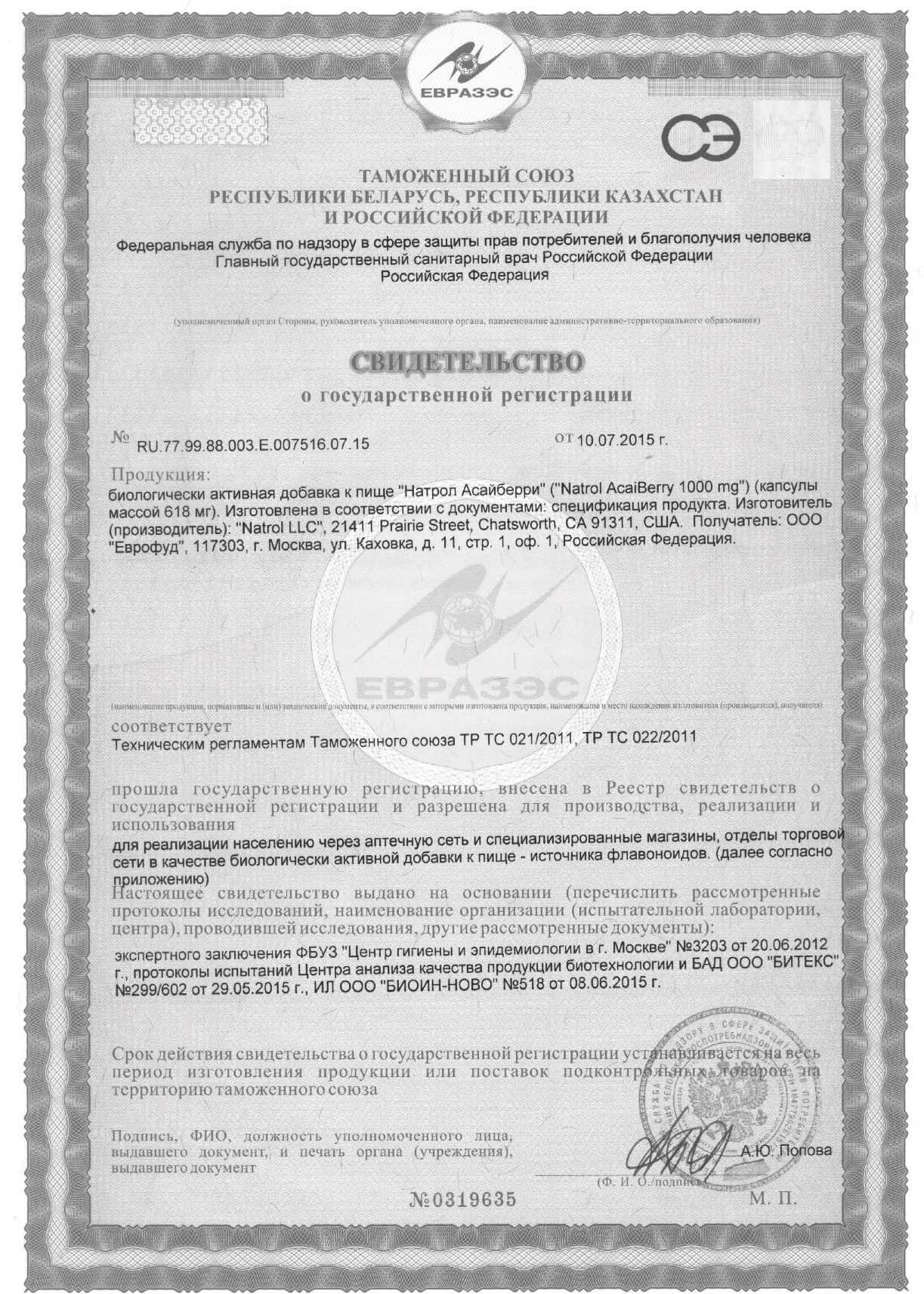 | Экстакт ягоды асаи (Euterpe Oleracea) | 1000 мг | |