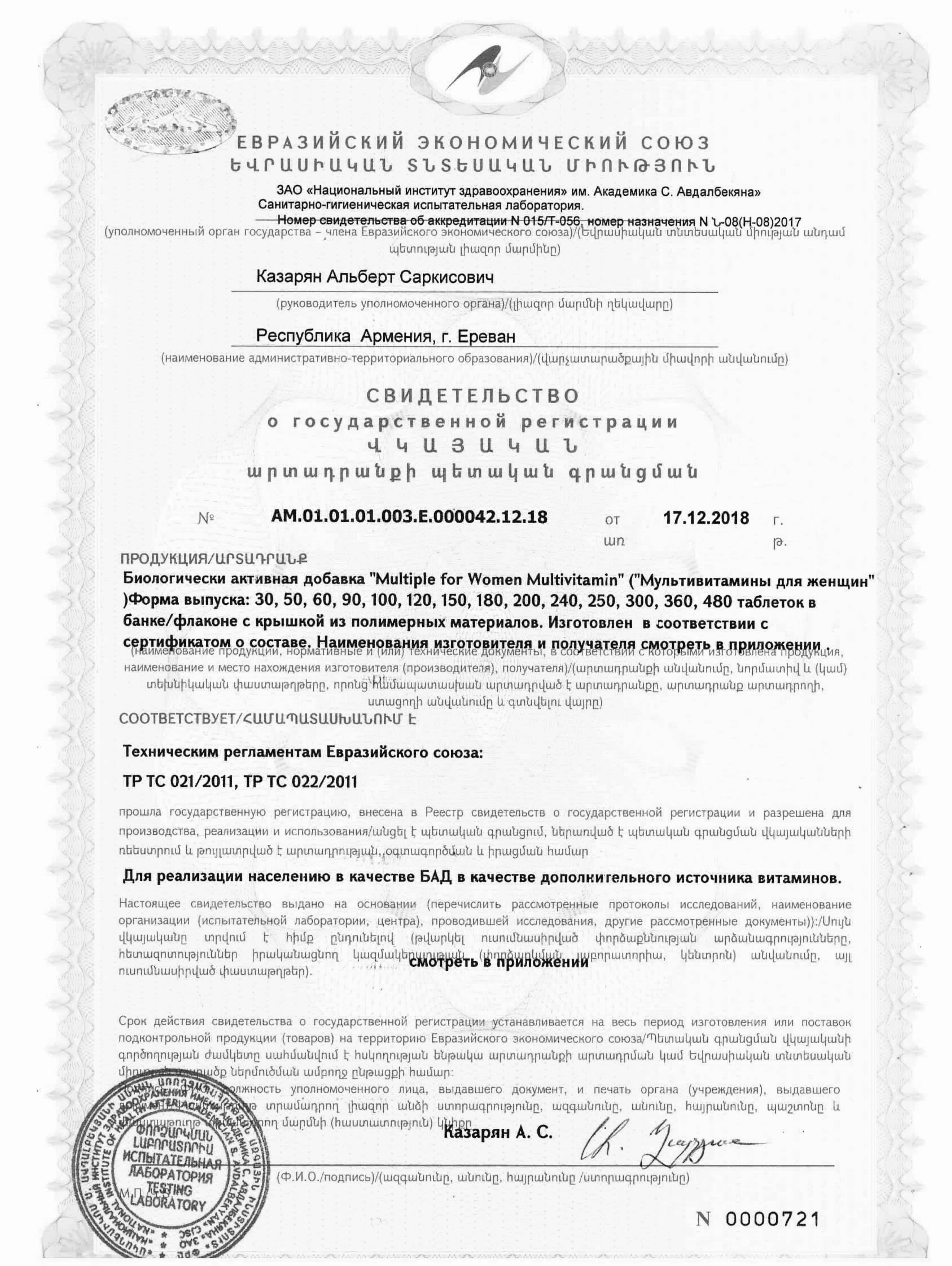 Целевая формула только для женщин, Multiple for Women является богатой питательными веществами формулой, состоящей из фолиевой кислоты, кальция и антиоксидантов, которые поддерживают общее женское здоровье и благополучие в любом возрасте и уровне подготовки.
