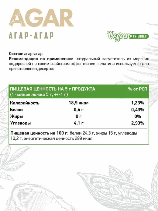 Способ применения: натуральный загуститель из морских водорослей по своим свойствам эффективнее желатина используется для приготовления десертов