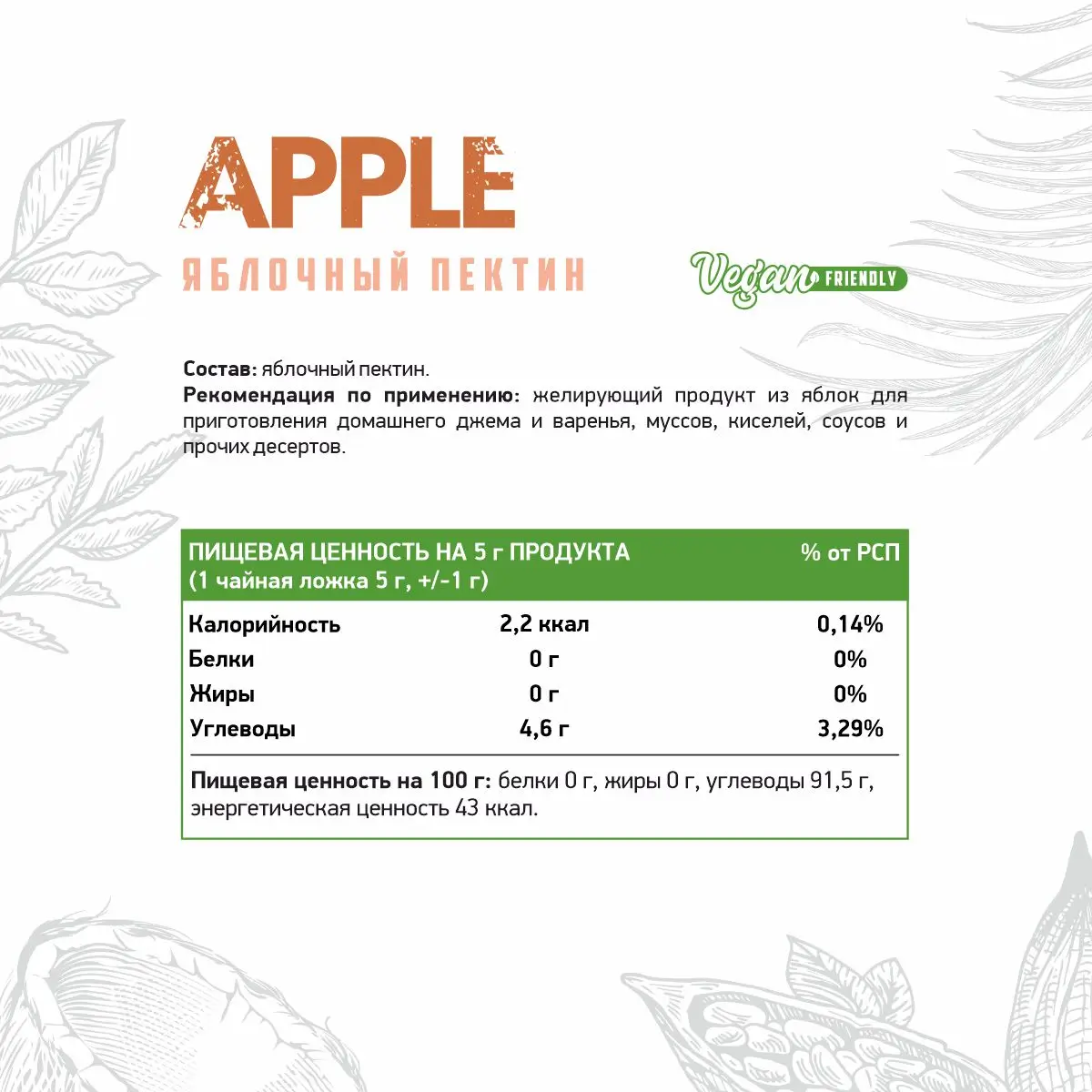 Способ применения: желирующий продукт из яблок для приготовления домашнего джема и варенья, муссов, киселей, соусов и прочих десертов.