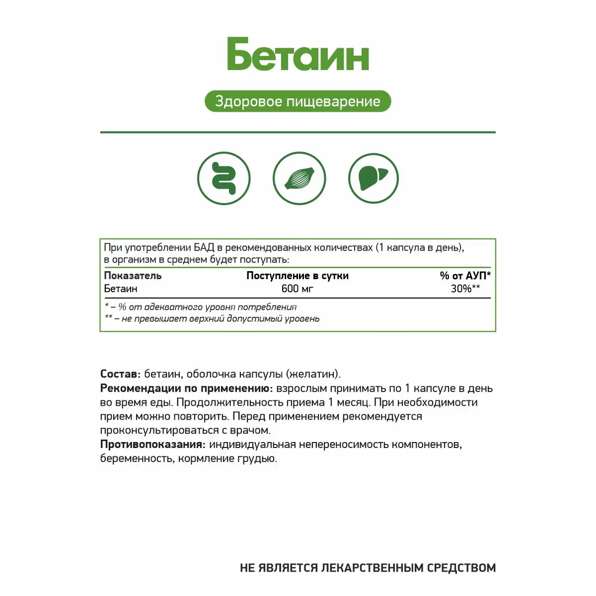 Бетаин HCL - является кислотной формой бетаина - витаминоподобного вещества, которое участвует во многих биохимических процессах.