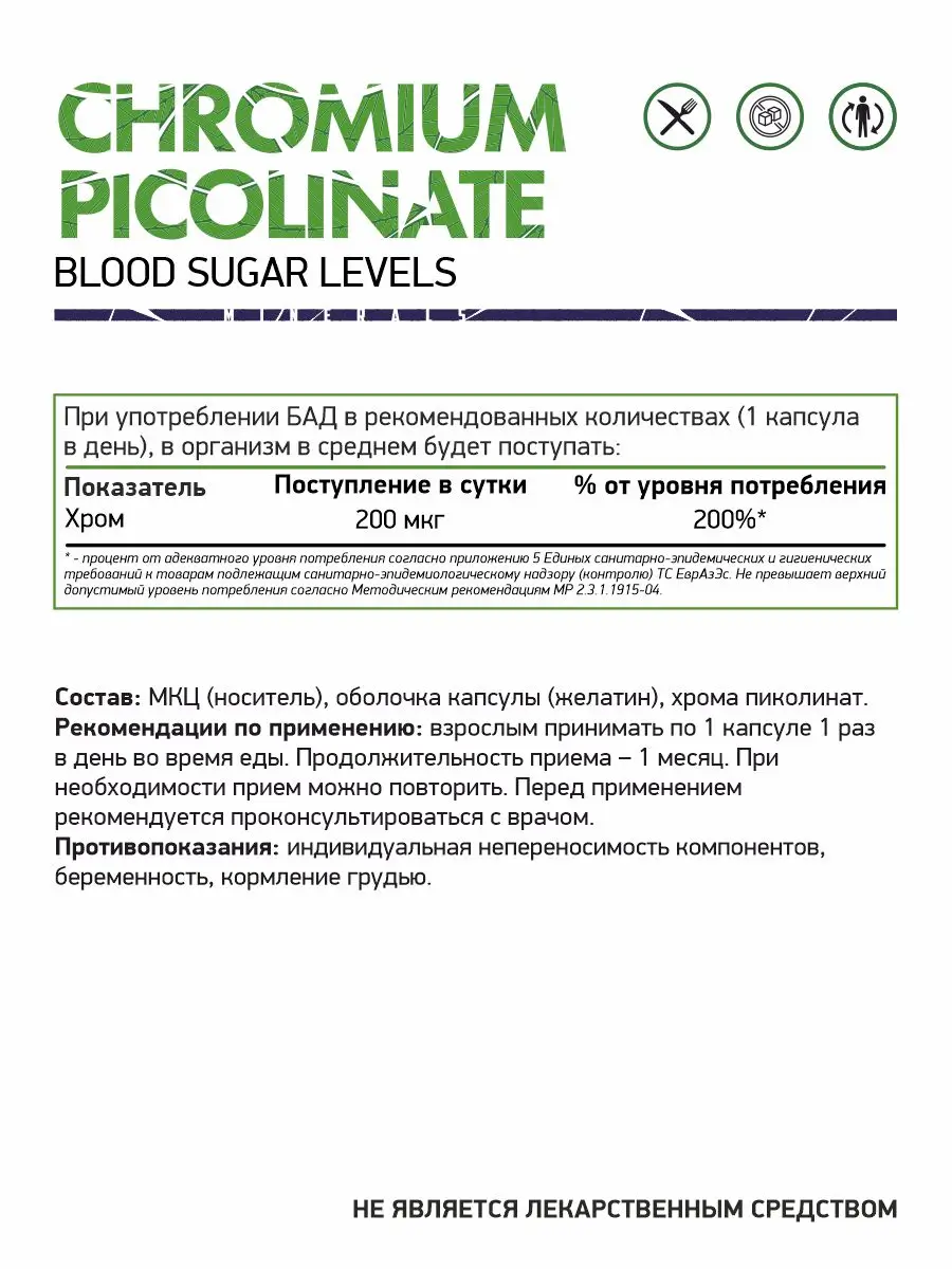 Пиколинат хрома- добавка, которую принимают вместе с пищей для поддержания нормального уровня хрома в организме, помогает избавиться от лишнего веса, предупреждает развитие атеросклероза и положительно действует на нервную систему. Именно поэтому пиколинат хрома активно используется спортсменами. Основным действующим компонентом в составе пиколината хрома является трехвалентная форма хрома. Также в него входит пиколиновая кислота, но как такового влияния на организм она не оказывает, а только улучшает усвояемость хрома.