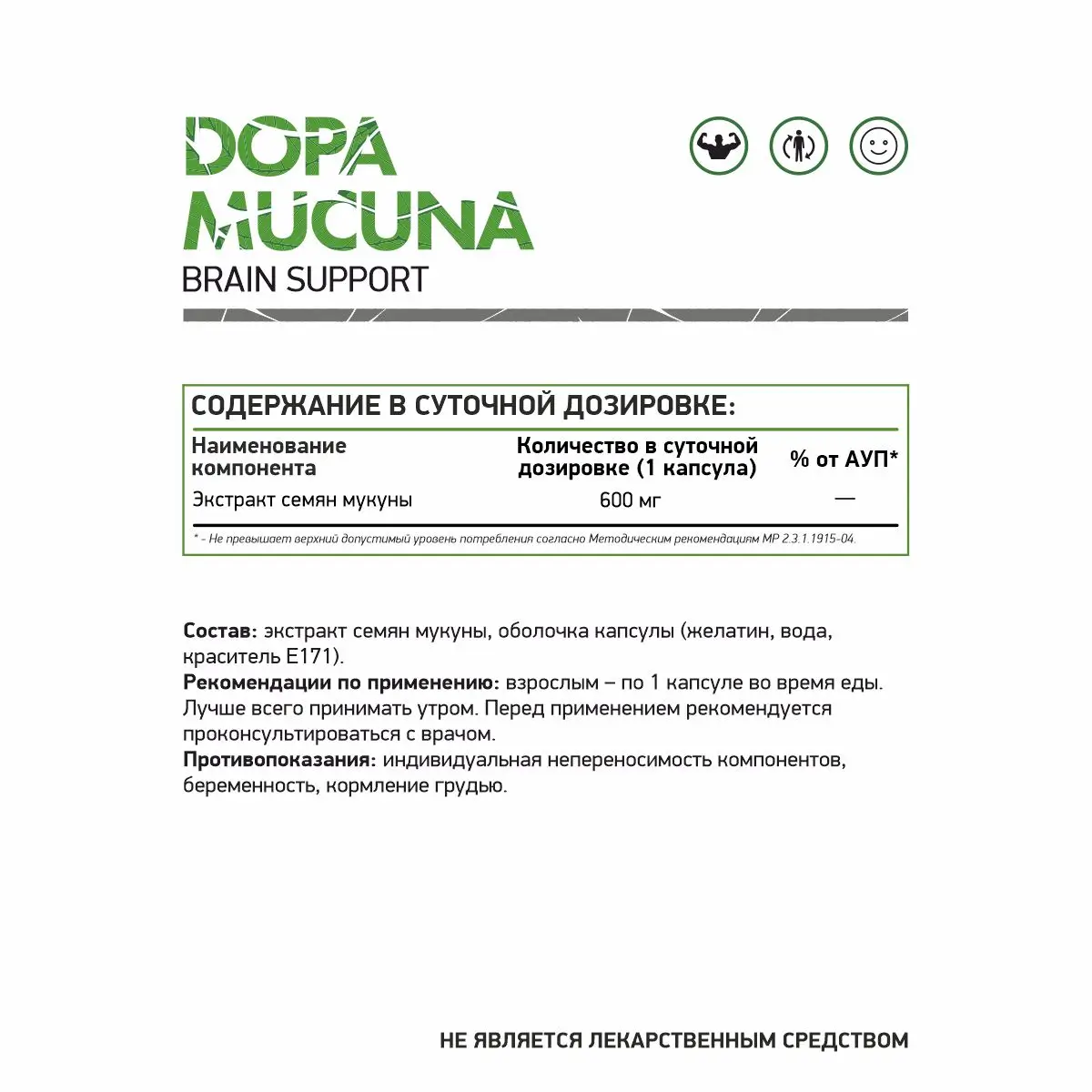 Допа Мукуна - натуральная добавка, полученная из экстракта тропического растения Мукуна Жгучая. Содержит алкалоиды, сапонины, терпеноиды, дубильные вещества и другие составляющие, которые являются мощными антиоксидантами. Основной из них — L-Допа — естественный предшественник катехоламинов: адреналина, норадреналина и дофамина.