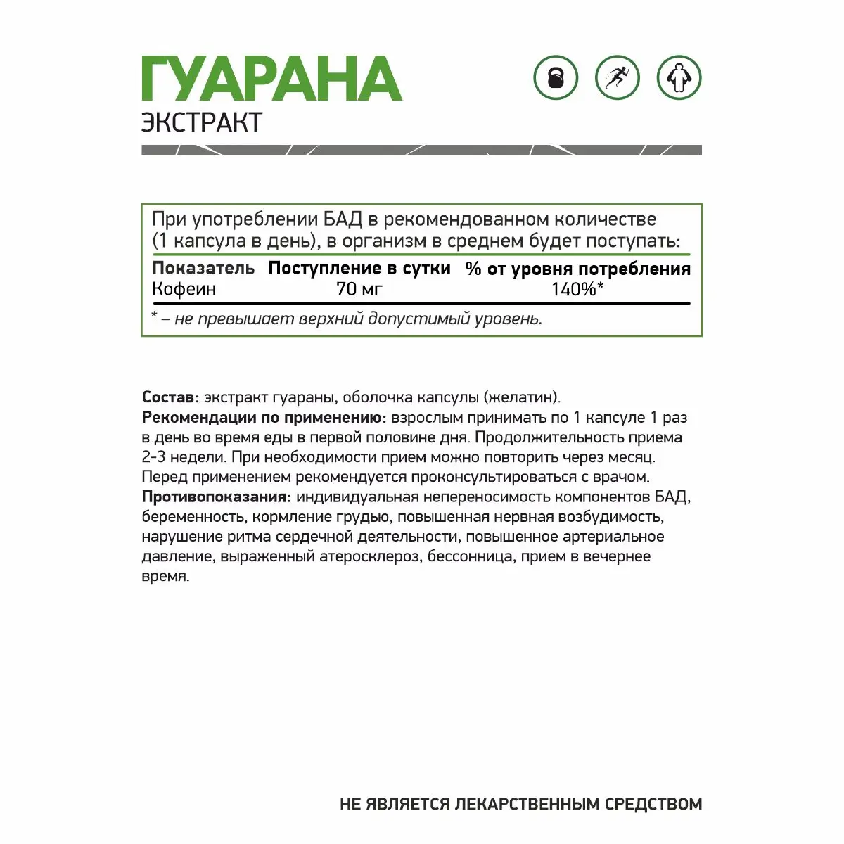 Гуарана - это натуральный растительный источник кофеина и других фитохимических веществ. Она содержит больше ксантиновых алкалоидов, чем кофеин, включая такие как теофиллин и теобромин и другие субстанции, такие как полифенолы. Экстракт гуараны обладает тонизирующим действием, стимулирует нервную систему, повышает физическую работоспособность, выносливость, а также, активизирует жировой обмена, который является важнейшим фактором для продолжительных физических нагрузок или в процессе похудения. Семена гуараны содержат в два раза больше кофеина, чем в кофейных зернах. Но действие гуараны отличается по механизму действия от кофейных напитков и больше напоминает действие чая – медленное малозаметное повышение бодрости, улучшение настроения и подъем энергии, который спустя несколько часов сходит на нет.
