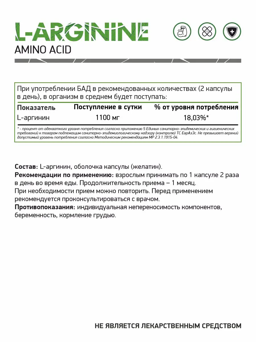 L-Аргинин - заменимая аминокислота, участвующая в процессах азотистого обмена. Регулирует иммунные и метаболические процессы. Играет важную роль в пластическом и энергетическом обмене.