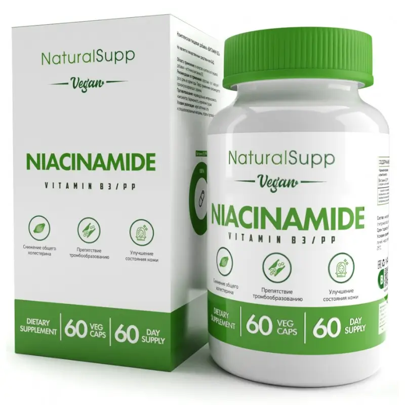 Витамин Б3 – (Ниацинамид, витамин PP) – это водорастворимый витамин, который играет жизненно важную роль в функционировании митохондрий клетки, помогая им вырабатывать энергию, участвует во многих окислительно-восстановительных реакциях: в липидном и углеводном обмене, а также, в образовании ферментов. Ниацин участвует также в репарации ДНК, в исправлении и восстановлении ее от химических повреждений и разрывов.