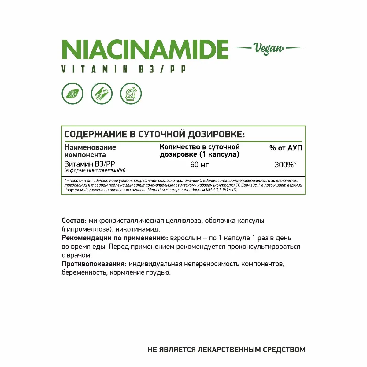 Ингредиенты: микрокристалическая целлюлоза, оболочка капсулы(гипромеллоза), никотинамид.