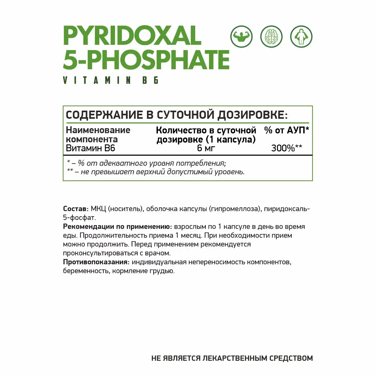 Витамин В6 (пиридоксин) — активное водорастворимое соединение, состоящее из трёх форм. Его активная форма Пиридоксаль 5-фосфат, служит коферментом в более чем 100 ферментативных реакциях и отлично усваивается организмом.