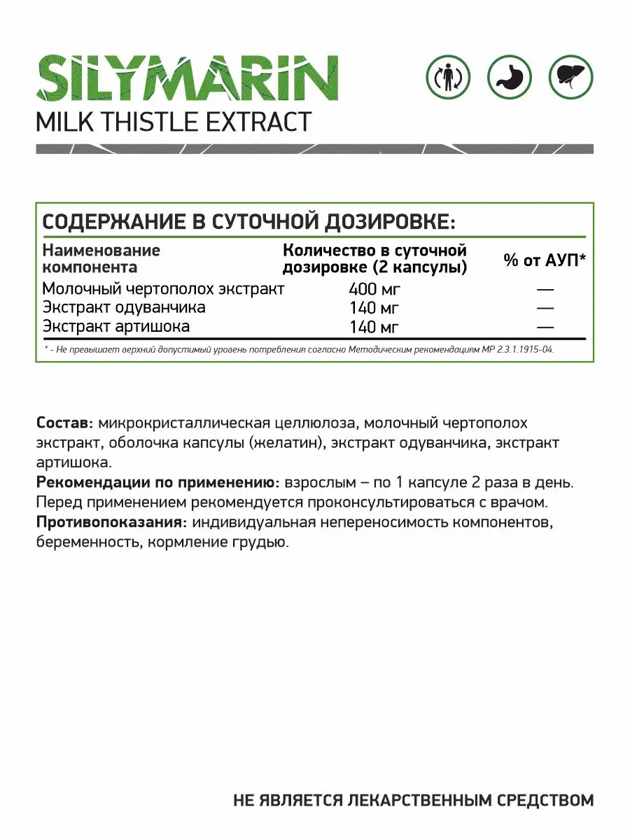 Силимарин является основным компонентом пищевой добавки Silymarin Milk Thistle Extract от компании Naturalsupp на основе экстракта расторопши. Он составляет около 80% от общей массы, оставшуюся часть занимают два добавочных вещества – экстракты из корня одуванчика лечебного и листьев артишока колючего.