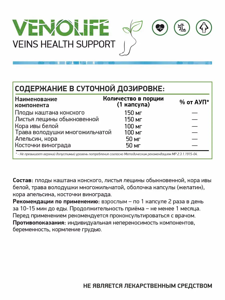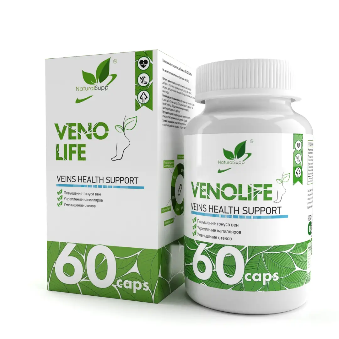 Венолайф - комплексная фитоформула, направленная на коррекцию нарушений в работе системы венозного кровообращения, которые являются причиной развития варикозной болезни. Благодаря наличию в составе многочисленных компонентов растительного происхождения, данный комплекс способен оказывать несколько лечебных эффектов: ангиопротективное (укрепление стенок сосудов, восстановление их упругости и эластичности), венотонизирующее действие (повышение тонуса несостоятельных вен, снижение проницаемости капилляров, нормализация кровообращения, улучшение лимфатического оттока). Обладает противовоспалительными (уменьшение адгезии воспалительных лейкоцитов к венозной стенке и их миграции в соседние ткани) и антиоксидантными свойствами (стабилизация клеточных мембран и защита от повреждения свободными радикалами, улучшение микроциркуляции и трофики тканей), за счет наличия активного полифенольного комплекса, хлорогеновой кислоты и витамина С. Улучшает реологические свойства крови и препятствует образованию тромбов.
