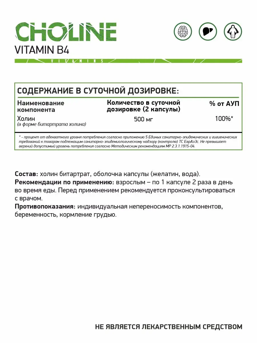 Холин (Витамин В4) является метаболическим предшественником важного нейромедиатора – ацетилхолина. Основным из свойств его является поддержание основных функций центральной нервной системы. Посредством холина происходит передача импульсов через клеточные мембраны и раннее развитие мозга. Холин активизирует скорость расщепления жиров, выступает сильнейшим гепатопротектором, который способствует ускорению структурного восстановления поврежденных тканей печени в результате токсического воздействия Помимо этого, витамин В4 способствует усвоению витаминов Е, К, А, D.