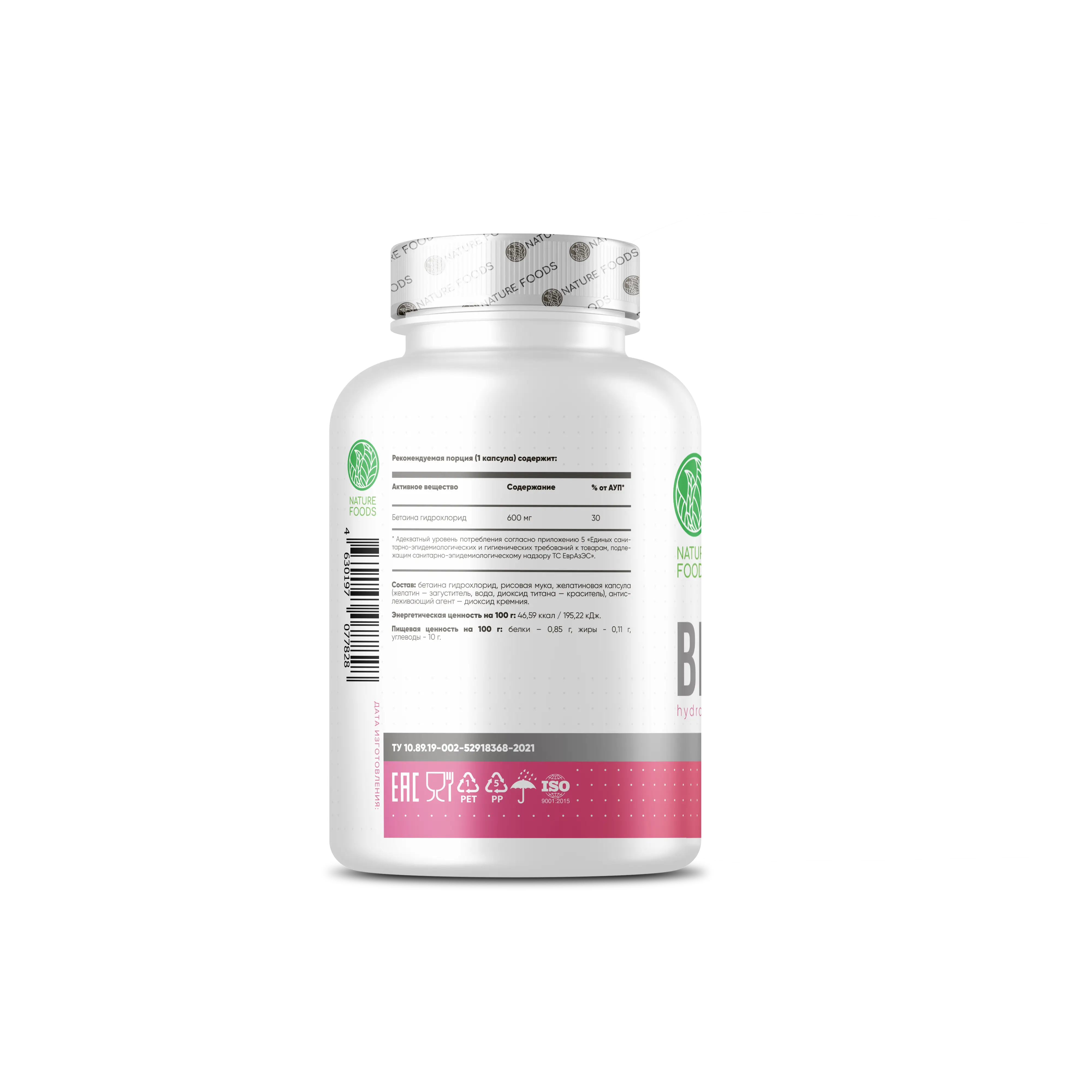 Состав: бетаина гидрохлорид, рисовая мука, желатиновая капсула (желатин — загуститель, вода, диоксид титана — краситель), антислеживающий агент — диоксид кремния.