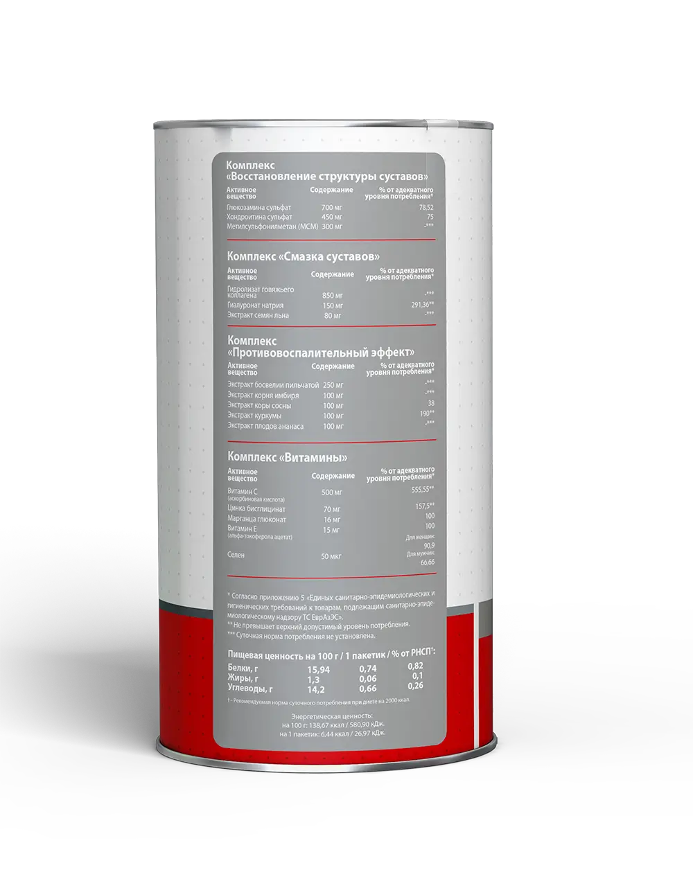 Состав: комплекс «Восстановление структуры суставов» (таблетка): глюкозамина сульфат, хондроитина сульфат, метилсульфонилметан (МСМ), наполнители - микрокристаллическая целлюлоза, крахмал; разрыхлитель – тальк; антислеживающие агенты - стеариновая кислота, диоксид кремния. Комплекс «Смазка суставов» (таблетка): гидролизат говяжьего коллагена, натрия гиалуронат, экстракт семян льна, наполнители - микрокристаллическая целлюлоза, крахмал; разрыхлитель – тальк; антислеживающие агенты - стеариновая кислота, диоксид кремния.