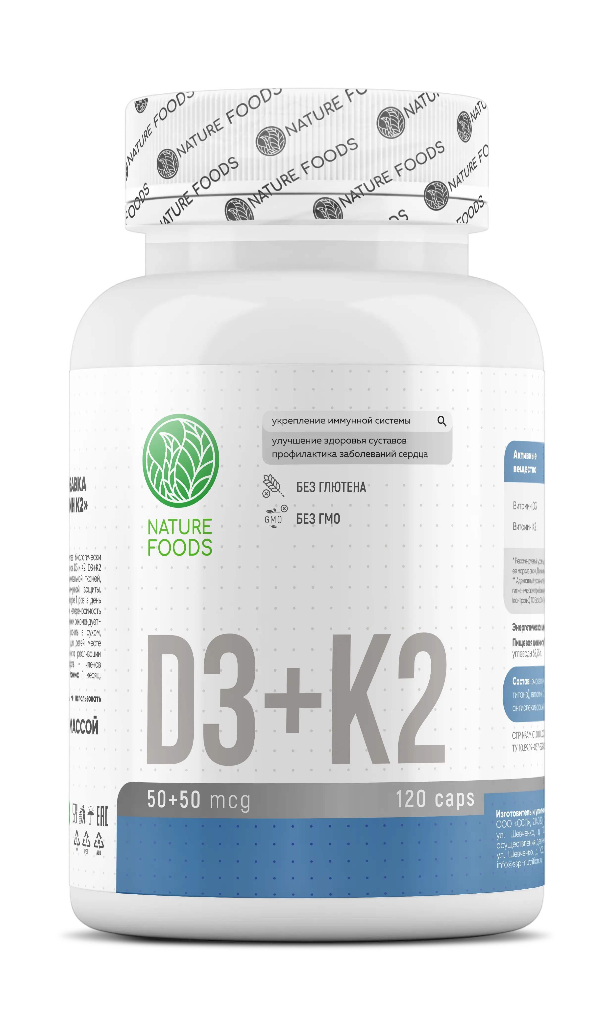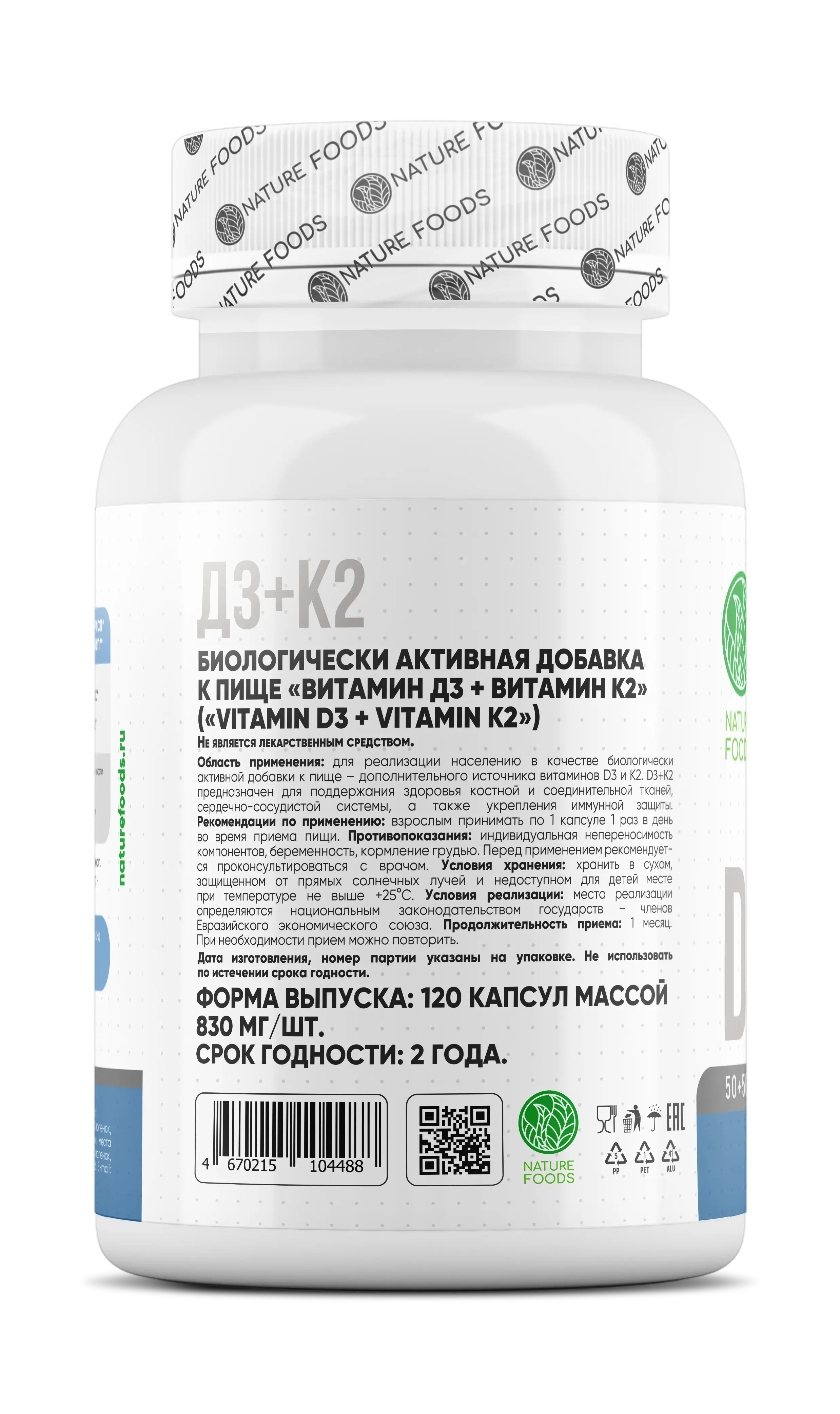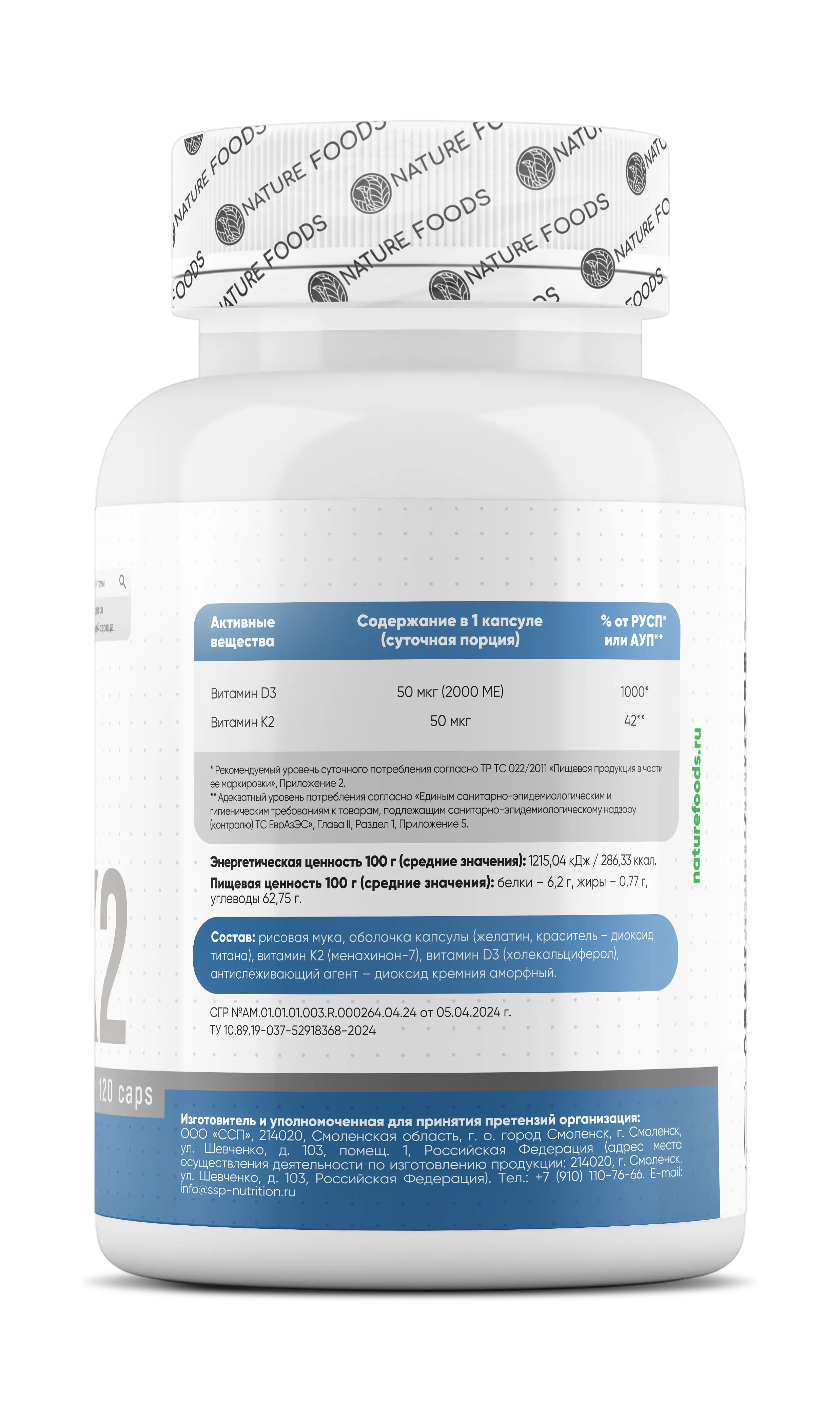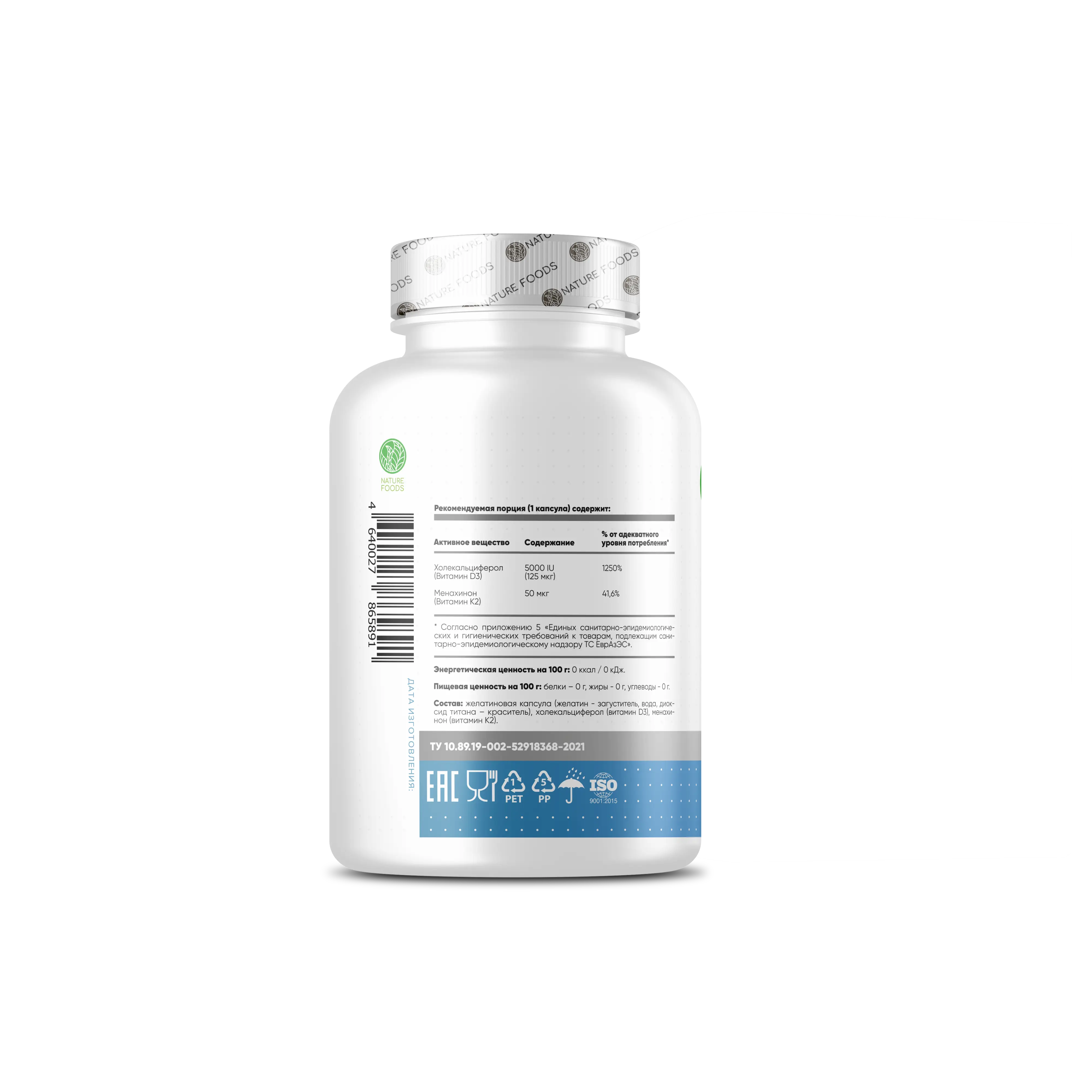 Nature Foods Vitamin D3+K2 имеет повышенную концентрацию и биодоступность, что позволяет принимать всего одну капсулу в день, полностью покрывая суточный дефицит.