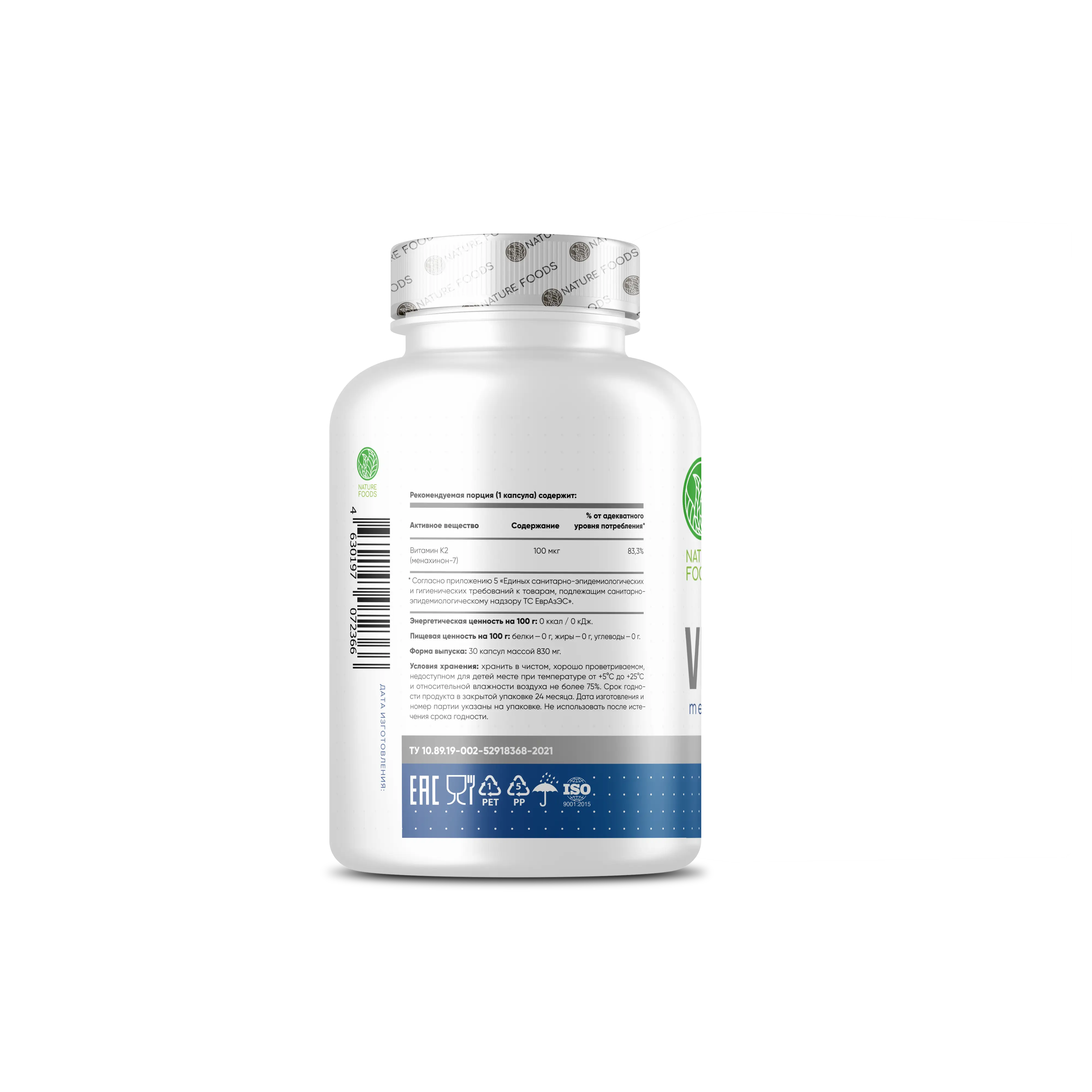 Состав: витамин К2 (менахинон-7), рисовая мука, желотиновоя капсула (желатин — загуститель, вода, диоксид титана - краситель) антислеживающий агент — диоксид кремния.