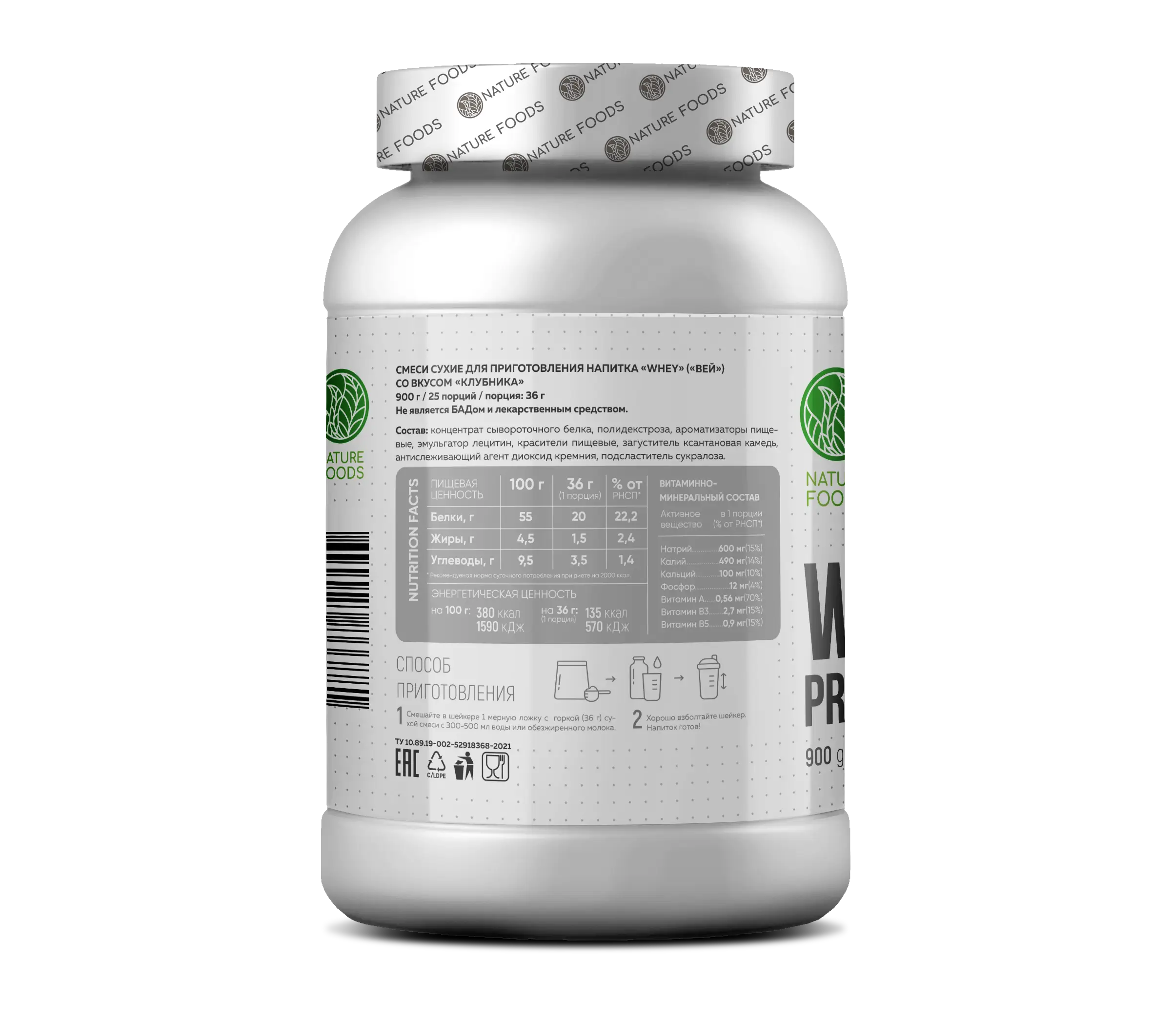 Nature Foods Whey не содержит в своем составе сахарозы, а так же дополнительно обогащен макроэлементами и витаминами.