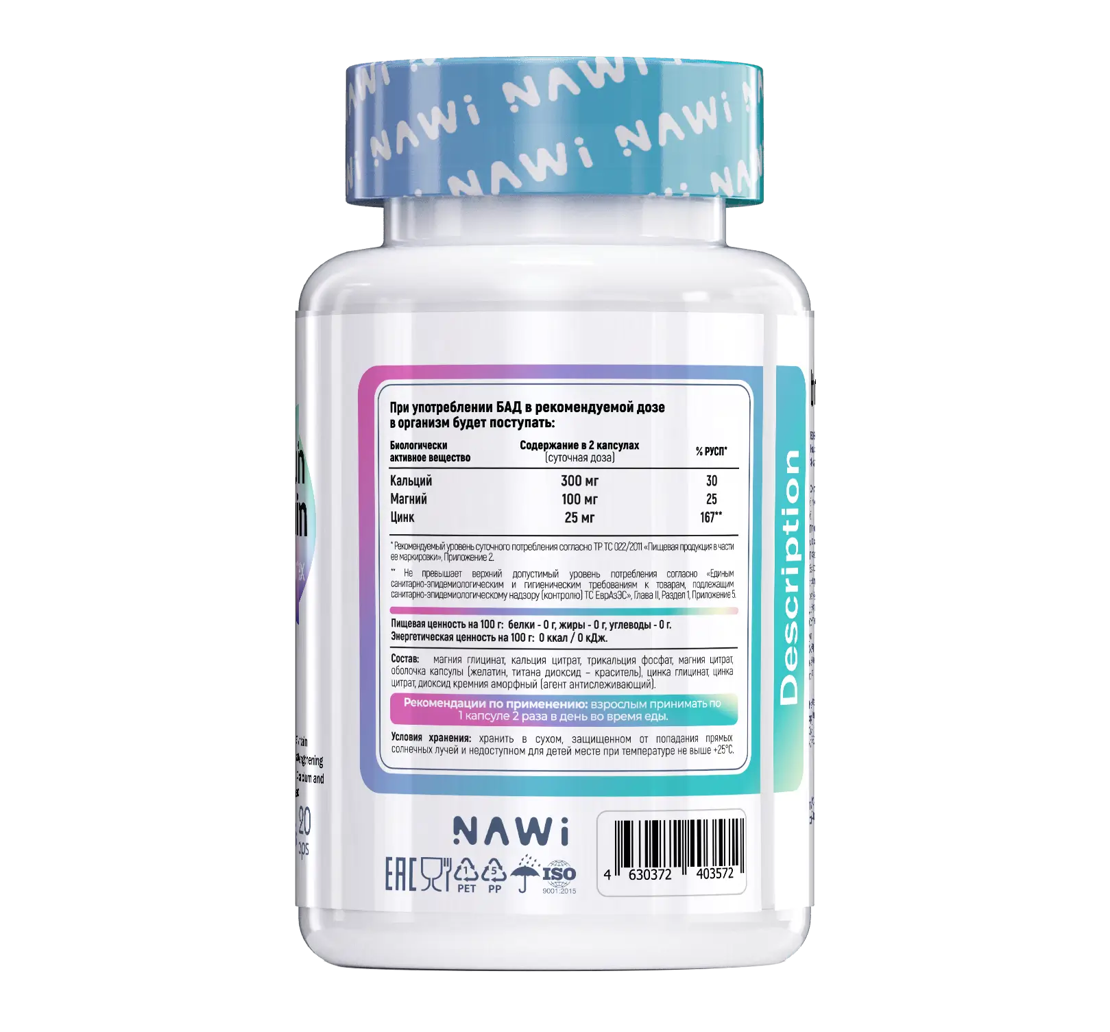 NAWI Calcium + Magnesium + Zinc – это комплексная добавка, обеспечивающая организм тремя ключевыми минералами для крепких костей, здоровья мышц и поддержки иммунной системы.