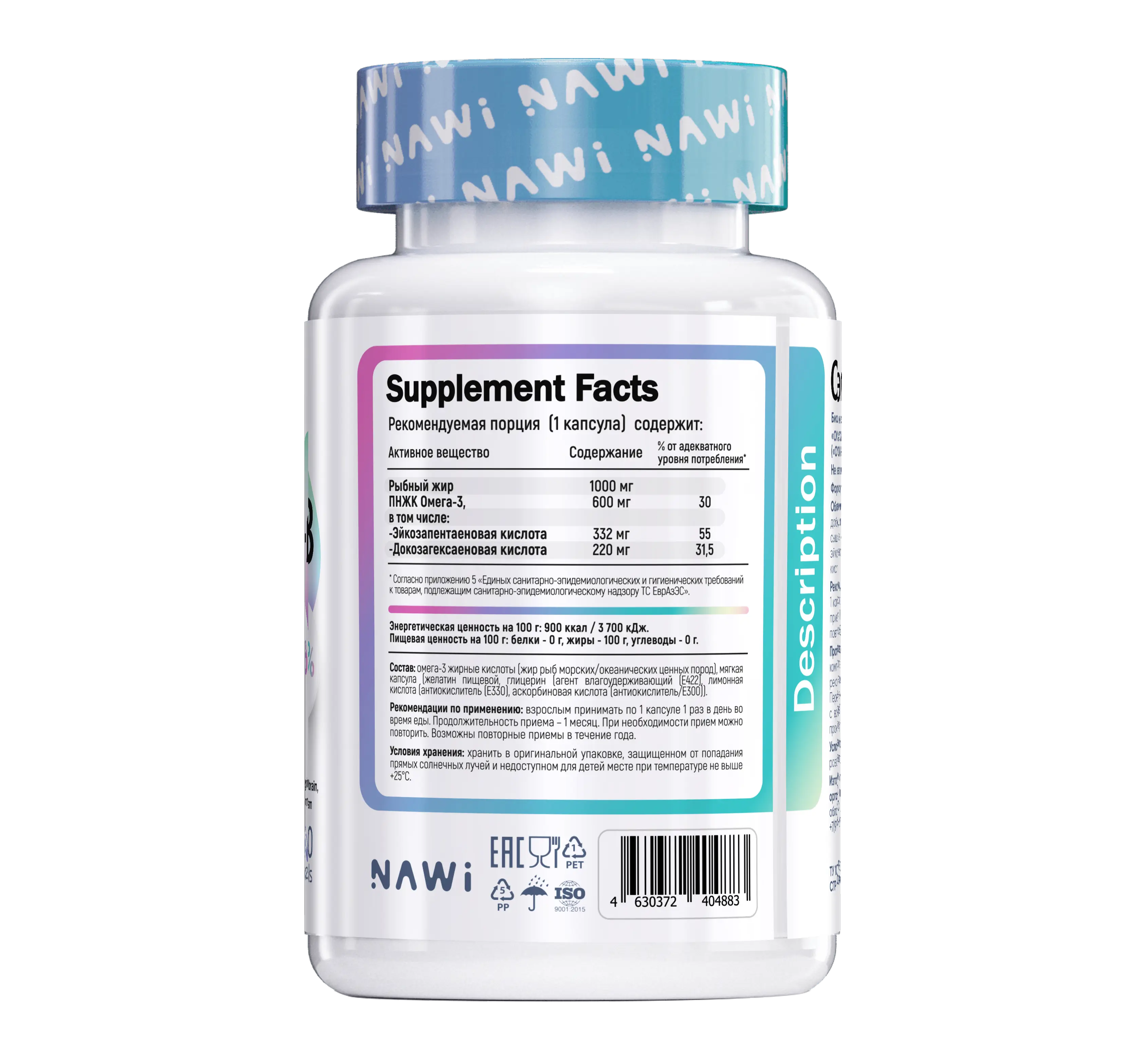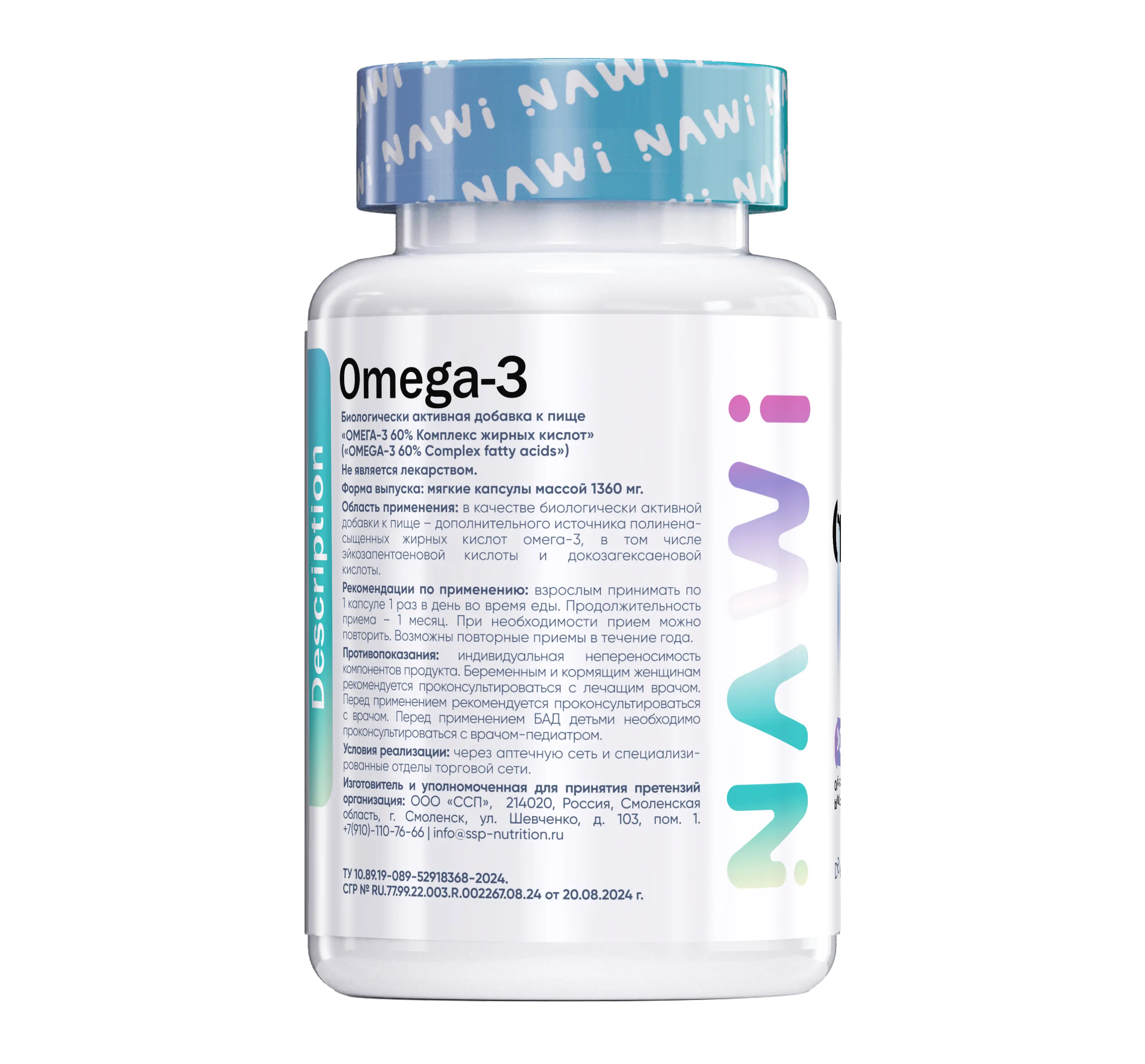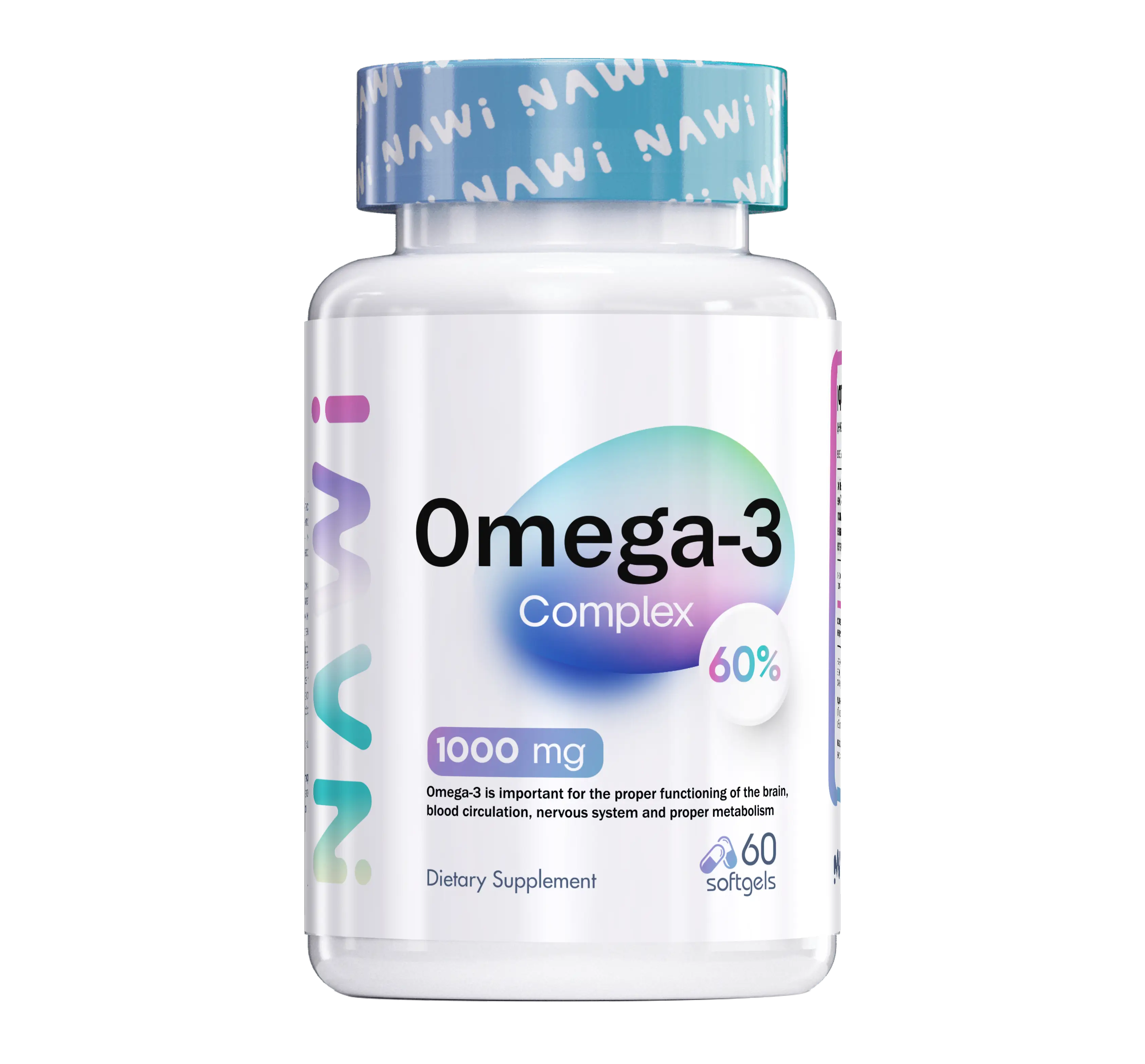 NAWI Omega-3 Complex — это высокоочищенные омега-3 жирные кислоты с концентрацией 35%, необходимыми для поддержания здоровья сердца, сосудов, мозга и нервной системы.