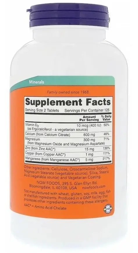 Состав - Витамин D2 (в виде эргокальциферола растительного происхождения), кальций (из цитрата кальция), магний (из оксида магния и аспартата магния), цинк (из цинка AAC), медь (из меди AAC), марганец (из марганца AAC), гидроксипропилцеллюлоза, растительная оболочка, кроскармеллоза натрия, диоксид кремния, стеарат магния (растительного происхождения) и стеариновая кислота (растительного происхождения).