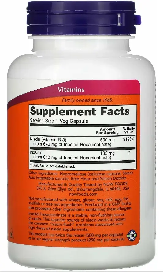 Ниацин (витамин B3) является важным витамином B-комплекса. «Ниацин без приливов» содержит инозитол гексаникотинат, форму ниацина, которая состоит из шести молекул ниацина, соединенных с одной молекулой инозитола. Он медленно распадается внутри организма на свободный ниацин и инозитол. Постепенное высвобождение ниацина позволяет избежать приливов, характерных для приема ниацина, которые многие не переносят.