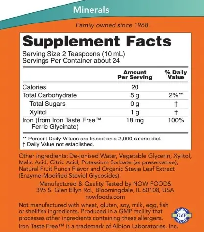 Железо — это основной минерал, имеющий ключевое значение в процессах выработки энергии, работе иммунной и нервной систем. Это важнейший компонент гемоглобина, молекулы, переносящей кислород к клеткам тела, а также миоглобина, который связывает кислород в мышечной ткани. Компания NOW использует не имеющий вкуса глицинат железа, который клинически продемонстрировал превосходную усвояемость и хорошо переносится благодаря своему мягкому и не вызывающему запоров действию.
