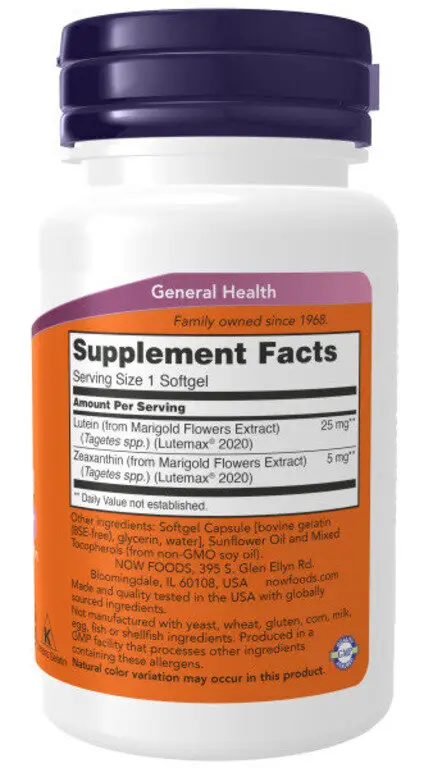 Лютеин и зеаксантин — это каротиноидные пигменты, которые часто вместе содержатся в овощах и ценятся за способность нейтрализовать свободные радикалы. В организме они находится в основном в макуле, специализированной области глаза, отвечающей за центральное зрение. Лютеин и зеаксантин действуют как первичный фильтр высокоэнергетического синего света и способствуют нормальному здоровью зрения, нейтрализуя свободные радикалы, образующиеся при воздействии света. Этот продукт способствует восстановлению зрения после воздействия яркого света и поддерживает здоровую контрастную чувствительность.
