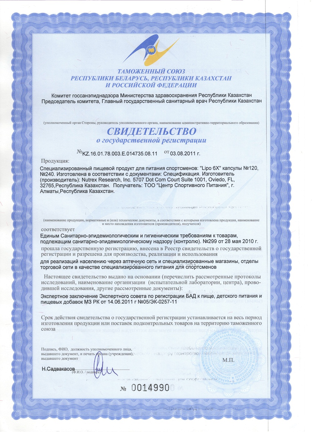 Первые два дня принимайте 2 капс. в день, одну — утром, вторую — во второй половине дня. 3–4 дни принимайте 3 капс. в день. 5 и последующие дни принимайте по 4 капс. в день. Lipo-6X следует принимать на пустой желудок, по крайней мере за 30 мин. до приема пищи. Рекомендуемый цикл: 8 недель приема и 1 неделя отдыха.