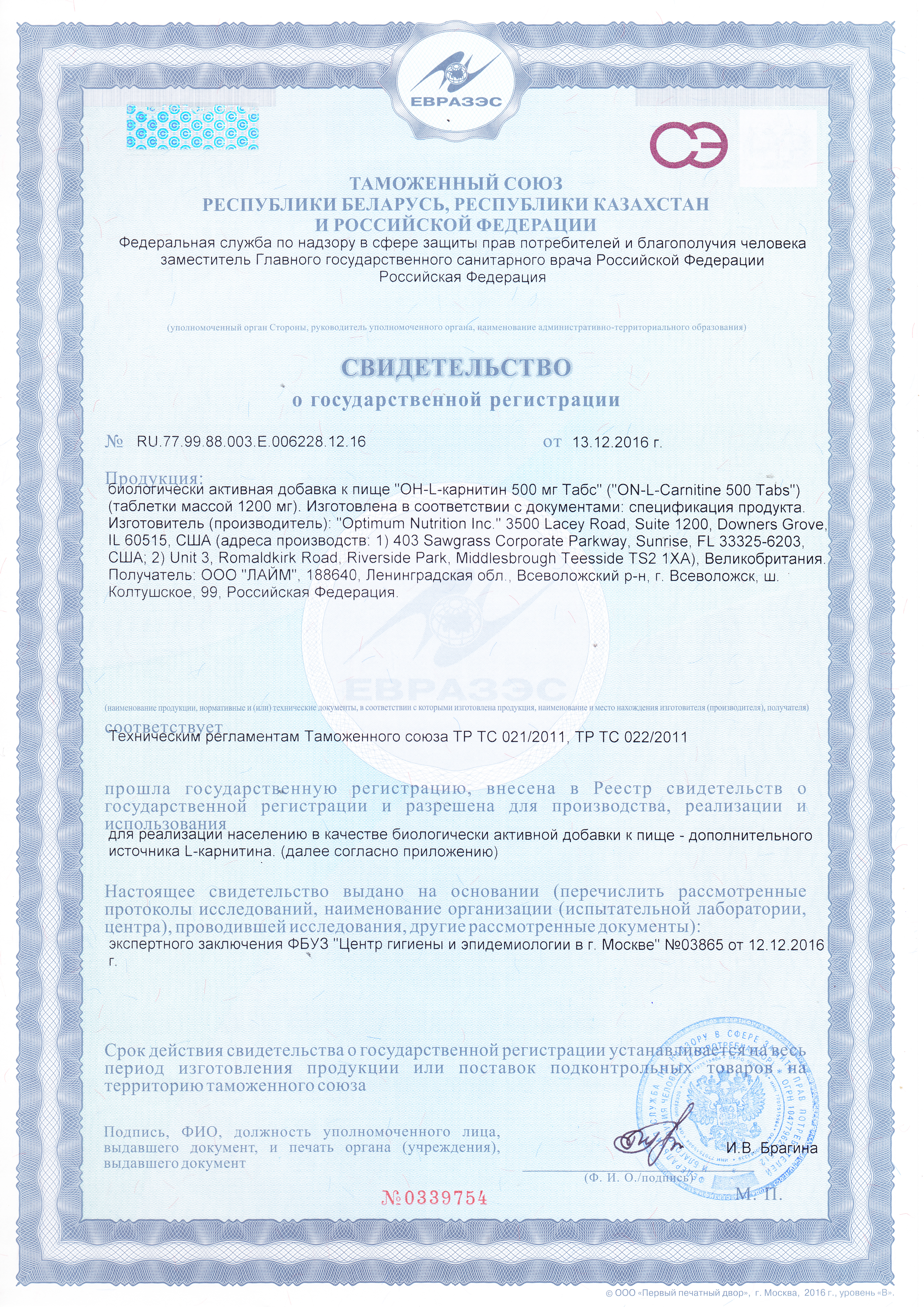 | L-карнитин (тартрат L-карнитина) | 500 мг | |