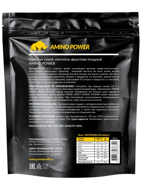 Состав: ВСАА 2:1:1 (лейцин, валин, изолейцин), аргинин альфа-кетоглутарат, бета-аланин, моногидрат креатина, лимонная кислота, натуральный краситель, ароматизатор, ацесульфам калия, сукралоза.