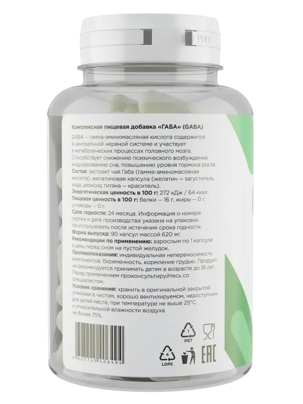 Состав: экстракт чая Габа (гамма-аминомасляная кислота), желатиновая капсула (желатин – загуститель, вода, диоксид титана – краситель).
