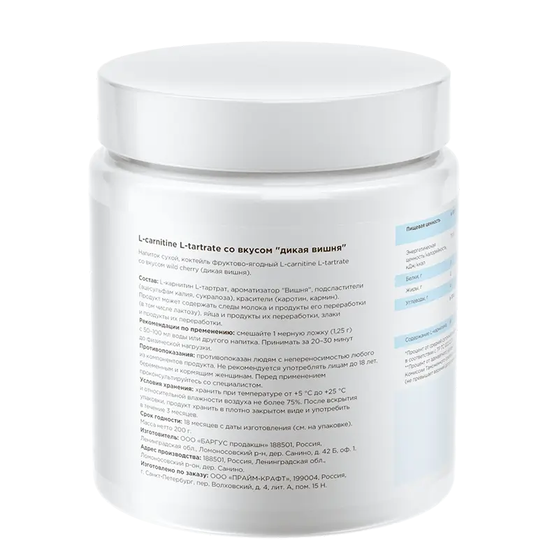 Состав: L-карнитин-L-тартрат, ароматизатор "Вишня", подсластители (ацесульфам калия, сукралоза), натуральный краситель кармин.