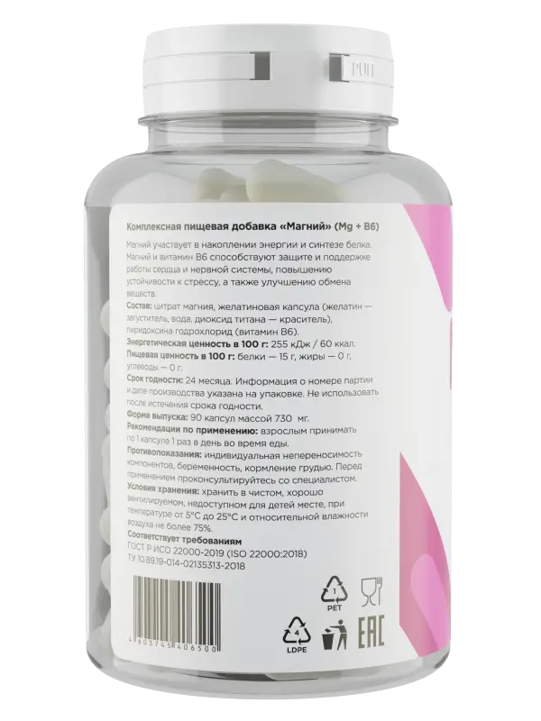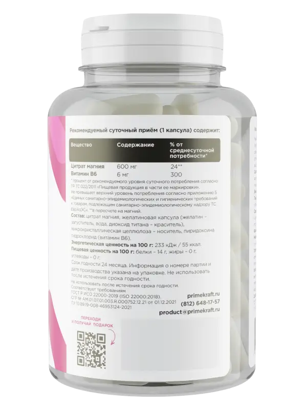 Состав: цитрат магния, желатиновая капсула (желатин – загуститель, вода, диоксид титана – краситель), пиридоксина гидрохлорид (витамин В6).