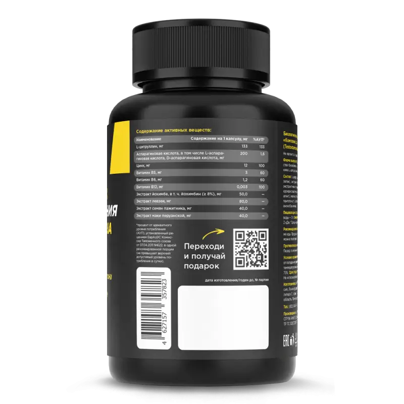 Состав: L-цитруллинDL-малат,L-аспарагиновая кислота,капсула (желатин),экстракт левзеи, D-аспарагиновая кислота, экстракт йохимбе, экстракт маки перуанской, экстракт семян пажитника, цитрат цинка, микрокристаллическая целлюлоза, диоксид кремния (антислёживающий агент), магния стеарат (антислёживающий агент), витамин В5 (кальция пантотенат), витамин В6 (пиридоксина гидрохлорид), витамин В12 (цианокобаламин).